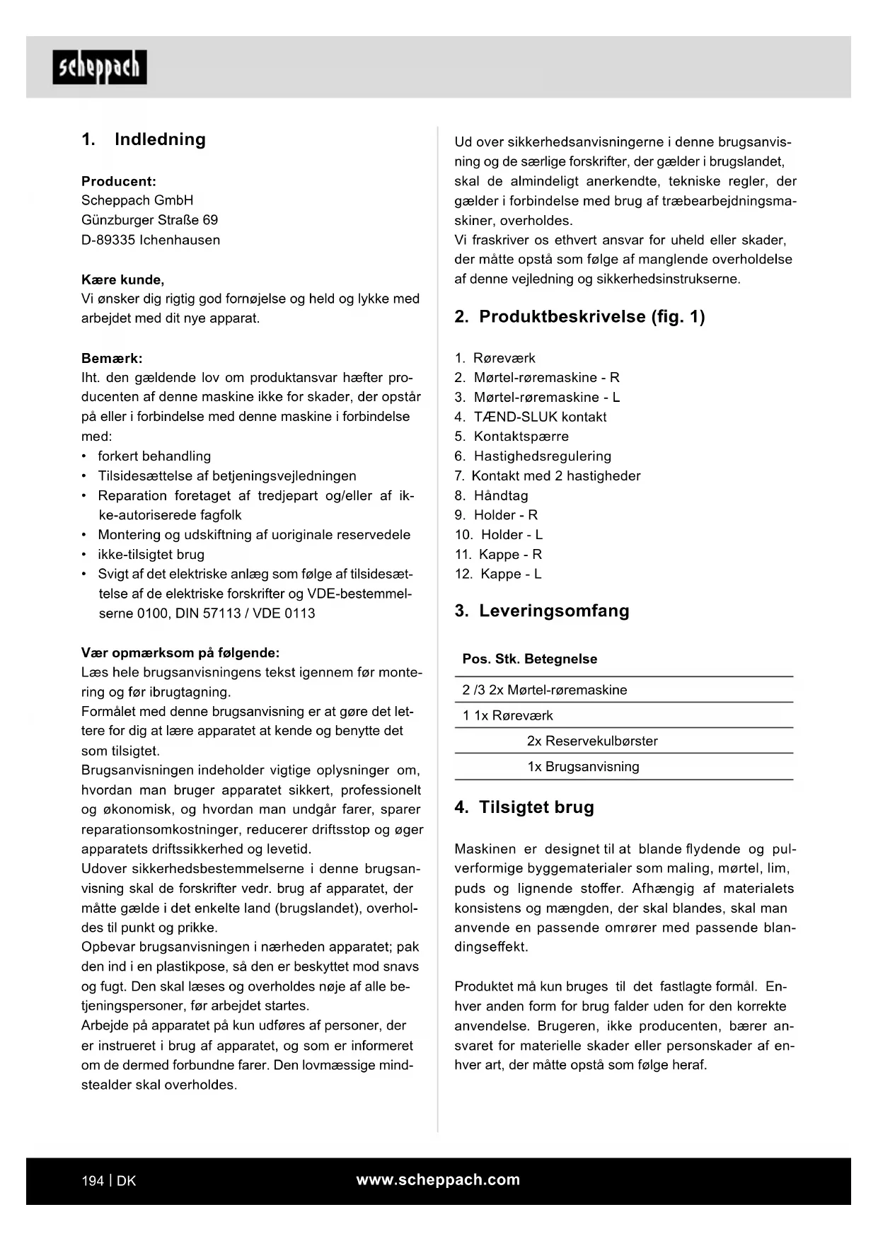 Pos. Stk. Betegnelse 2 /3 2x Mørtel-røremaskine 1 1x Røreværk 2x Reservekulbørster 1x Brugsanvisning