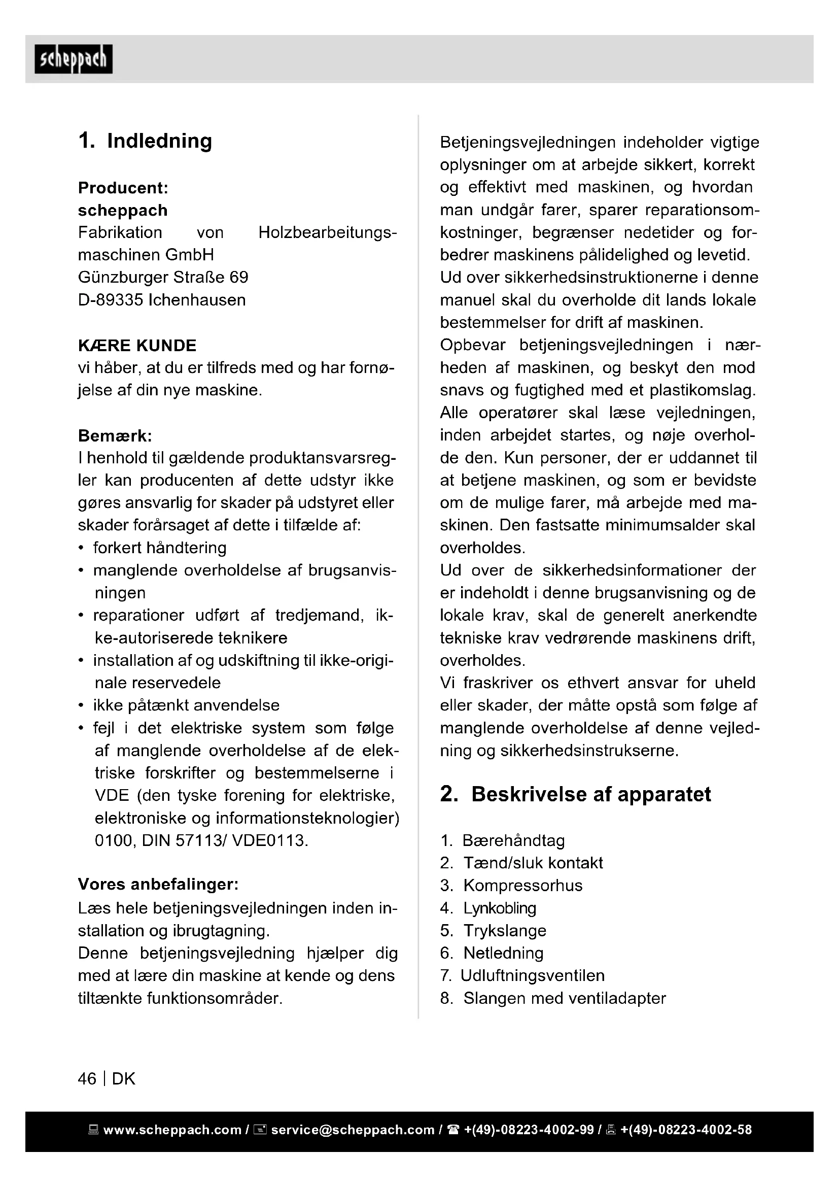 www.scheppach.com / service@scheppach.com / +(49)-08223-4002-99 / +(49)-08223-4002-58 Betjeningsvejledningen indeholder vigtige oplysninger om at arbejde sikkert, korrekt og eektivt med maskinen, og hvordan man undgår farer, sparer reparationsom- kostninger, begrænser nedetider og for- bedrer maskinens pålidelighed og levetid. Ud over sikkerhedsinstruktionerne i denne manuel skal du overholde dit lands lokale bestemmelser for drift af maskinen. Opbevar betjeningsvejledningen i nær- heden af maskinen, og beskyt den mod snavs og fugtighed med et plastikomslag. Alle operatører skal læse vejledningen, inden arbejdet startes, og nøje overhol- de den. Kun personer, der er uddannet til at betjene maskinen, og som er bevidste om de mulige farer, må arbejde med ma- skinen. Den fastsatte minimumsalder skal overholdes. Ud over de sikkerhedsinformationer der er indeholdt i denne brugsanvisning og de lokale krav, skal de generelt anerkendte tekniske krav vedrørende maskinens drift, overholdes. Vi fraskriver os ethvert ansvar for uheld eller skader, der måtte opstå som følge af manglende overholdelse af denne vejled- ning og sikkerhedsinstrukserne.