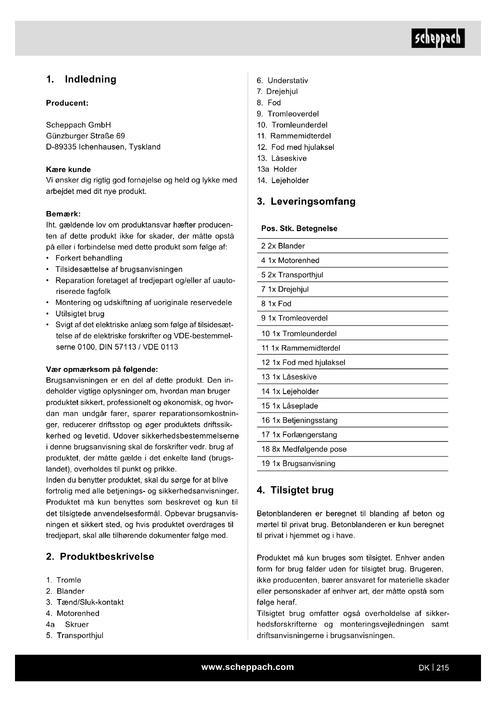 Pos. Stk. Betegnelse 2 2x Blander 4 1x Motorenhed 5 2x Transporthjul 7 1x Drejehjul 8 1x Fod 9 1x Tromleoverdel 10 1x Tromleunderdel 11 1x Rammemidterdel 12 1x Fod med hjulaksel 13 1x Låseskive 14 1x Lejeholder 15 1x Låseplade 16 1x Betjeningsstang 17 1x Forlængerstang 18 8x Medfølgende pose 19 1x Brugsanvisning