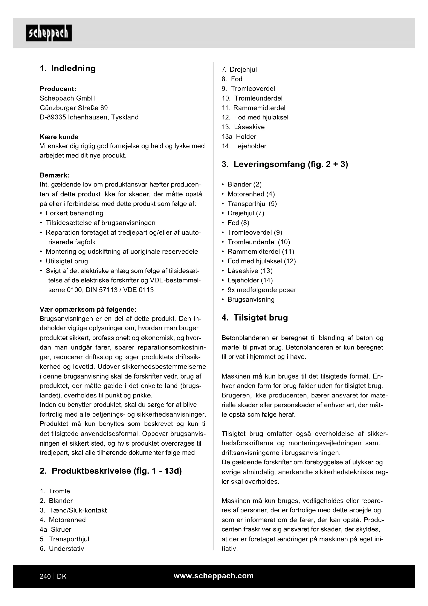 m ADVARSEL! Fare for personskade! Produktet kan starte uventet og derved medføre per- sonskader. - Sluk motoren inden enhver form for rengørings- og vedligeholdelsesarbejde. - Træk netstikket ud, før der foretages vedligehol- delses- og monteringsarbejde. BEMÆRK! Fare for beskadigelse! Hvis der trænger vand ind i motorenheden, kan der opstå motorskader. Undlad at slå på blandetromlen med hårde genstande (hammer, skovl osv.). En bulet blandetromle påvirker blandeprocessen og er desuden svær at rengøre. - Rengør produktet med en børste eller skraber. - Undlad at nedsænke produktet i vand eller andre væsker, og sprøjt ikke motorenheden med en høj- tryksrenser.www.scheppach.com