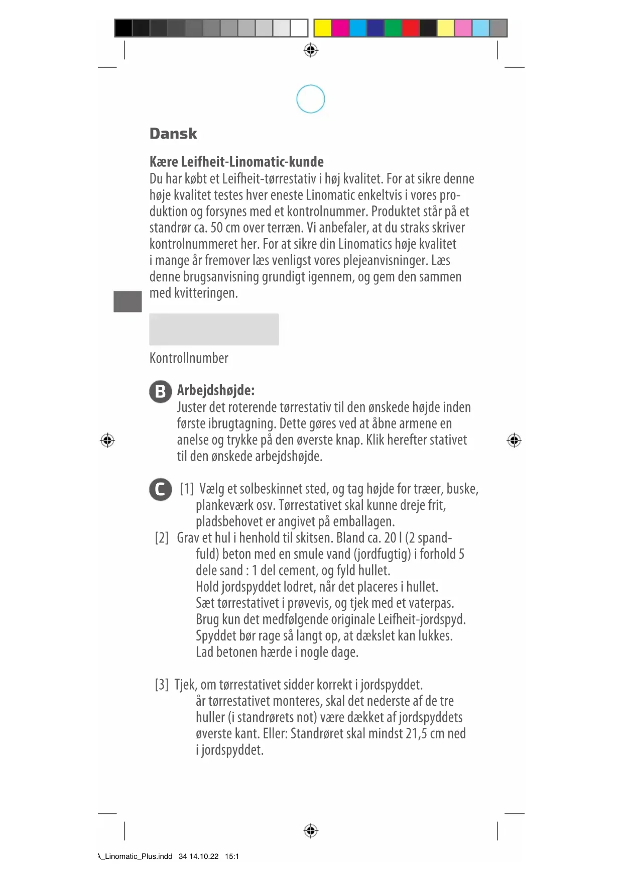 Rens standrøret fra tid til anden med en fugtig klud og lidt rengøringsmiddel. Du kan med fordel gnide standrøret med en klud med en gængs syntetisk plejespray. Når tørresta- tivet er klappet ud, kan du spraye en smule plejespray ind i bærearmenes line-indtræksåbninger. Fjern med jævne mellemrum jord, sand og vand fra jordspyddet. Sikkerhedsanvisninger: Linomatic-tørrestativet fra Leifheit er beregnet til udendørs, privat brug og må kun bruges i henhold til oplysningerne i denne brugsanvisning. Enhver brug, der ikke er i overensstemmelse med produktets formål, er ikke tilladt. *BA_Linomatic_Plus.indd 35 14.10.22 15:11Børn kan blive kvalt i tørresnorene, hvis de bruger tørrestativet uden opsyn. For at undgå kvælning og sammenviklede snore må tørrestativet kun bruges uden for børns rækkevidde. Børn kan få viklet snorene om halsen. Undlad at binde snorene sammen. Sørg for, at snorene ikke bliver viklet ind i hinanden og danner knuder. Tjek tørrestativet og træklinen for beskadigelser inden hver brug. Et beskadiget tørrestativ bør ikke fortsat bruges. Hvis en line klemmes sammen mellem kunststof- afdækningerne: Skub linen forsigtigt i den dertil beregnede runde udgangsåbning. Fjern aldrig kunststof-afdækningen! Hvis linen er viklet omkring standrøret, en bærearm eller afdækningen: Fold tørrestativet lidt sammen, og læg linen tilbage. Hvis linerne er blevet våde: Lad linerne tørre, mens tørre- stativet er klappet ud. Bedienungs-, Pege- und Sicherheitshinweise / Operating, care and safety instructions. / Instructions d’utilisation, instructions d‘entretien et consignes de sécurité / Bedienings-, verzorgings- en veiligheidsaanwijzingen / Istruzioni per l‘uso e il mantenimento e avvertenze di sicurezza / Instrucci- ones de uso, mantenimiento y seguridad / Pokyny pro obsluhu, ošetřování a bezpečnost / Pokyny na obsluhu, ošetrovanie a bezpečnostné pokyny / Wskazówki dotyczące obsługi, konserwacji i bezpieczeństwa / Bruks-, skötsel- och säkerhetsanvisningar / Bet- jenings-, pleje- og sikkerhedsanvisninger / Naudojimo, priežiūros ir saugos nurodyma / Kasutus- hooldus- ja ohutusjuhised