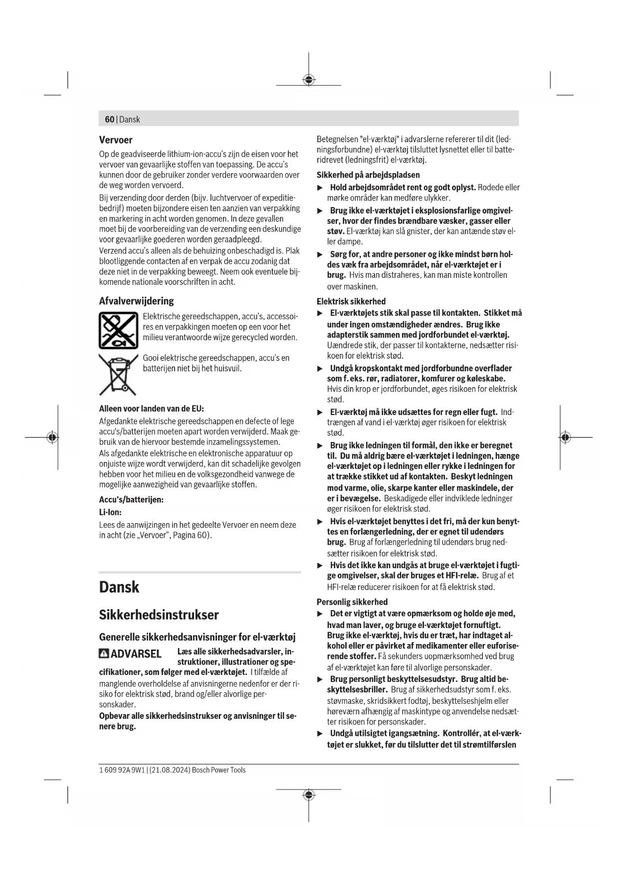 Målt ved 20−25°C med akkuGBA18V4.0Ah. B) afhængigt af den anvendte akku C) begrænset ydelse ved temperaturer < 0°C Tekniske data bestemt med den medfølgende akku. Værdierne kan varierer afhængigt af produktet samt anvendelses- og miljøbetingelserne. Du kan finde flere oplysninger under www.bosch-professional.com/wac. Støj-/vibrationsinformation Støjemissionsværdier fundet iht. EN IEC 62841-2-6. El-værktøjets A‑vægtede støjniveau er typisk: Lydtrykniveau97dB(A); lydeffektniveau105dB(A). Usik- kerhed K=3dB. Brug høreværn! Vibrationer samlet værdi a