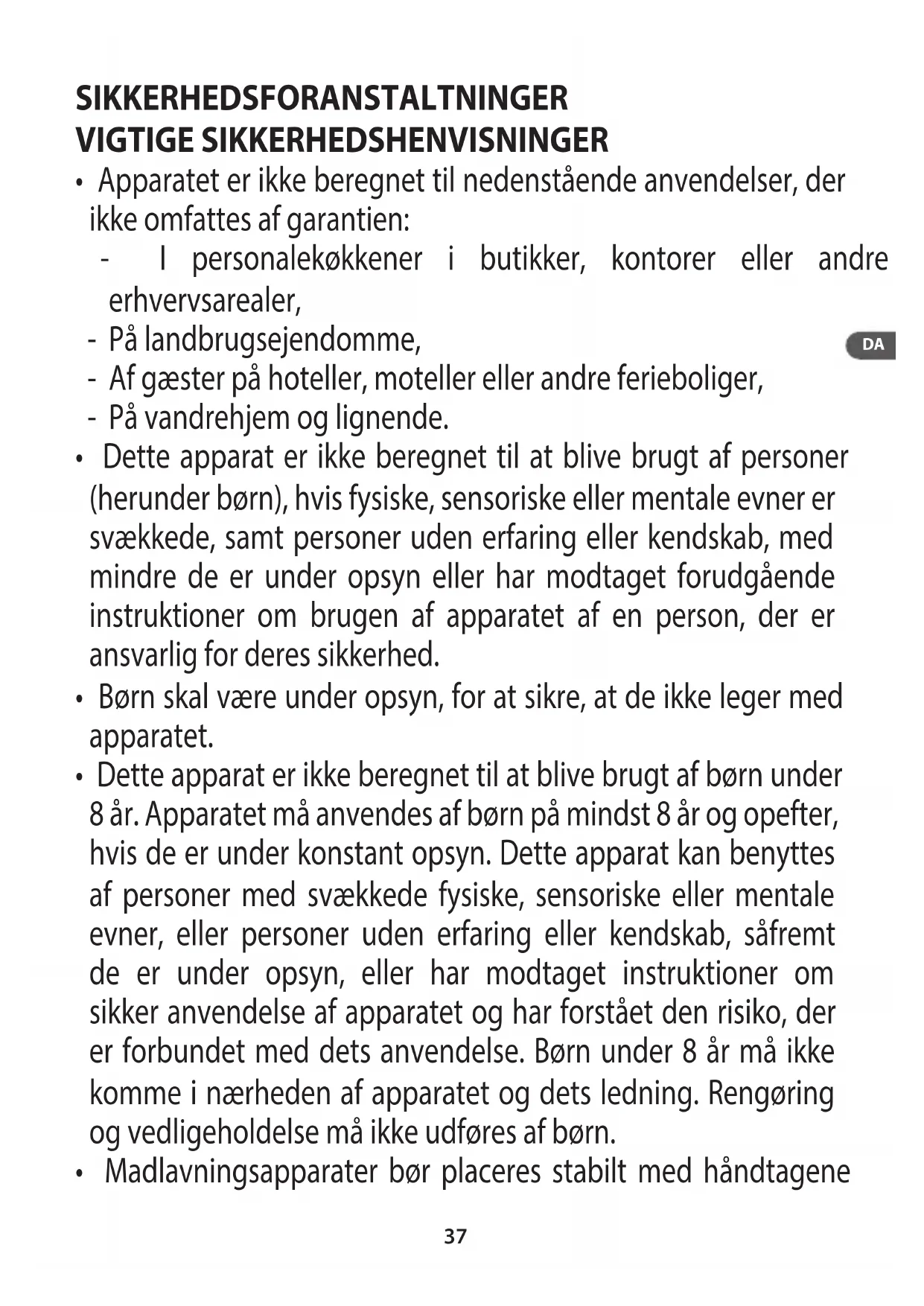 - Apparatet er designet udelukkende til husholdningsbrug og ikke udendørs brug. Ved professionel brug, ureglementeret brug eller misligholdelse af apparatet frafalder producentens ansvar og reklamationsretten.