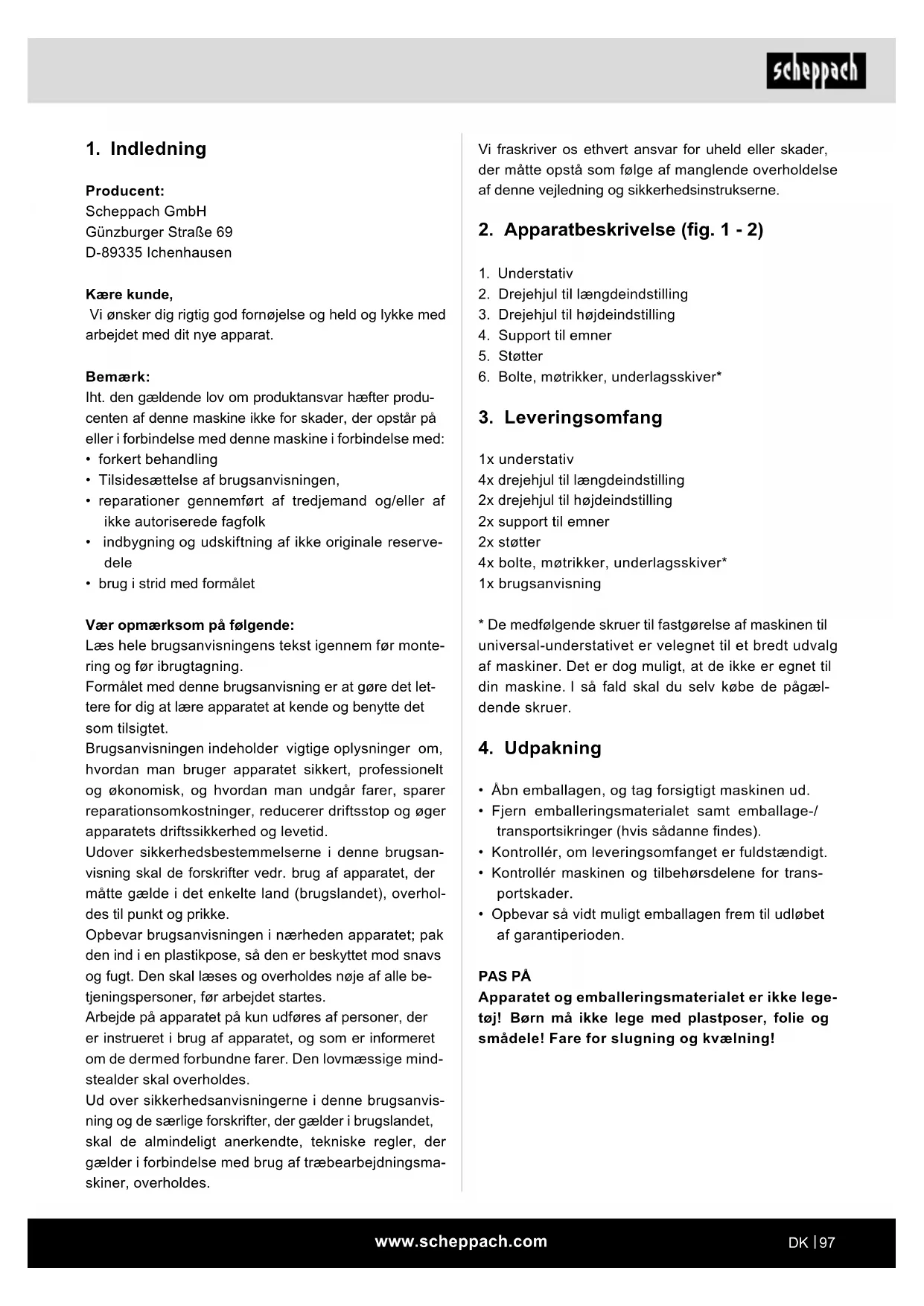 - Opbevar så vidt muligt emballagen frem til udløbet af garantiperioden. PAS PÅ Apparatet og emballeringsmaterialet er ikke lege- tøj! Børn må ikke lege med plastposer, folie og smådele! Fare for slugning og kvælning!www.scheppach.com