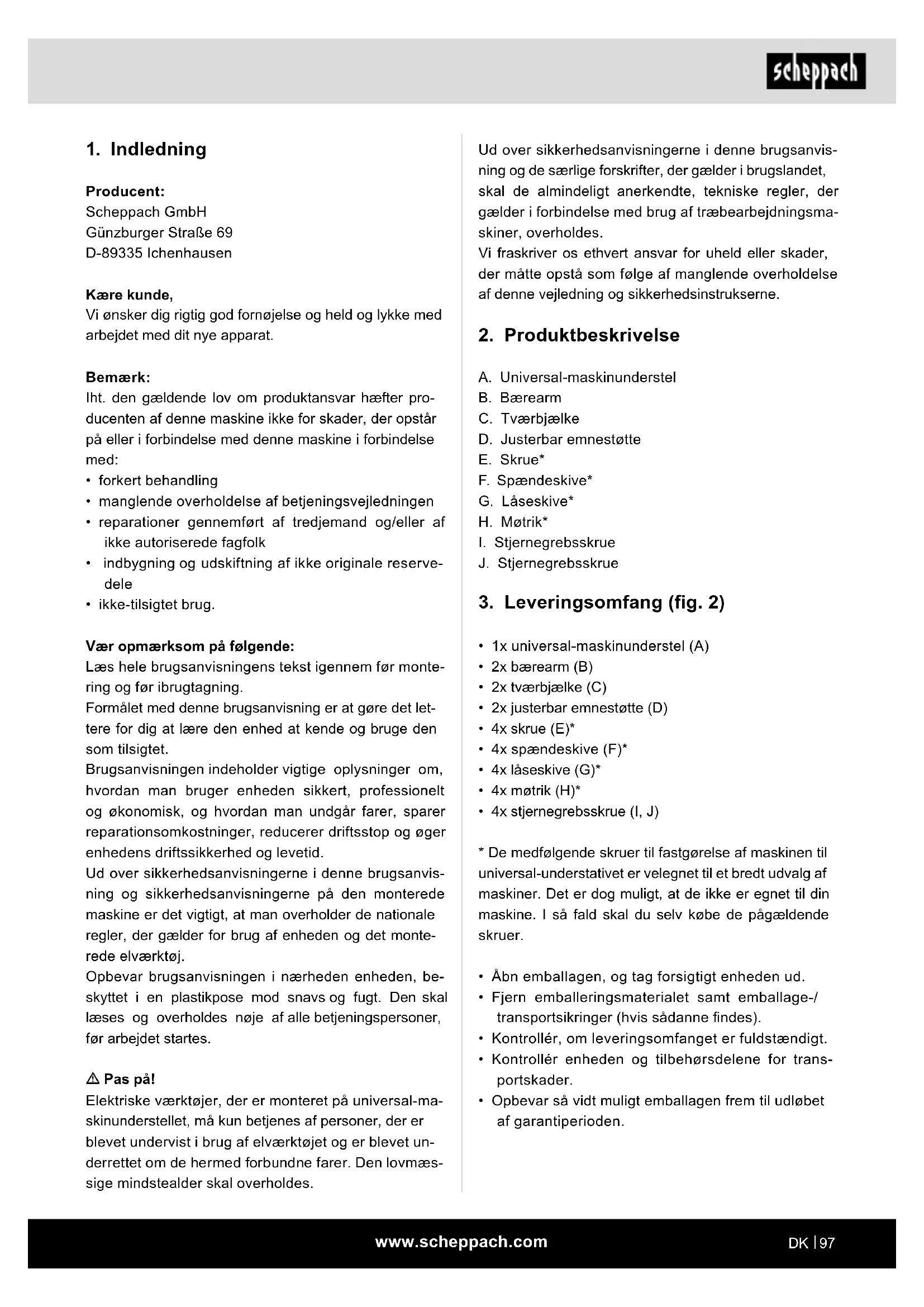 - ikke-tilsigtet brug. Vær opmærksom på følgende: Læs hele brugsanvisningens tekst igennem før monte- ring og før ibrugtagning. Formålet med denne brugsanvisning er at gøre det let- tere for dig at lære den enhed at kende og bruge den som tilsigtet. Brugsanvisningen indeholder vigtige oplysninger om, hvordan man bruger enheden sikkert, professionelt og økonomisk, og hvordan man undgår farer, sparer reparationsomkostninger, reducerer driftsstop og øger enhedens driftssikkerhed og levetid. Ud over sikkerhedsanvisningerne i denne brugsanvis- ning og sikkerhedsanvisningerne på den monterede maskine er det vigtigt, at man overholder de nationale regler, der gælder for brug af enheden og det monte- rede elværktøj. Opbevar brugsanvisningen i nærheden enheden, be- skyttet i en plastikpose mod snavs og fugt. Den skal læses og overholdes nøje af alle betjeningspersoner, før arbejdet startes. m Pas på! Elektriske værktøjer, der er monteret på universal-ma- skinunderstellet, må kun betjenes af personer, der er blevet undervist i brug af elværktøjet og er blevet un- derrettet om de hermed forbundne farer. Den lovmæs- sige mindstealder skal overholdes.www.scheppach.com