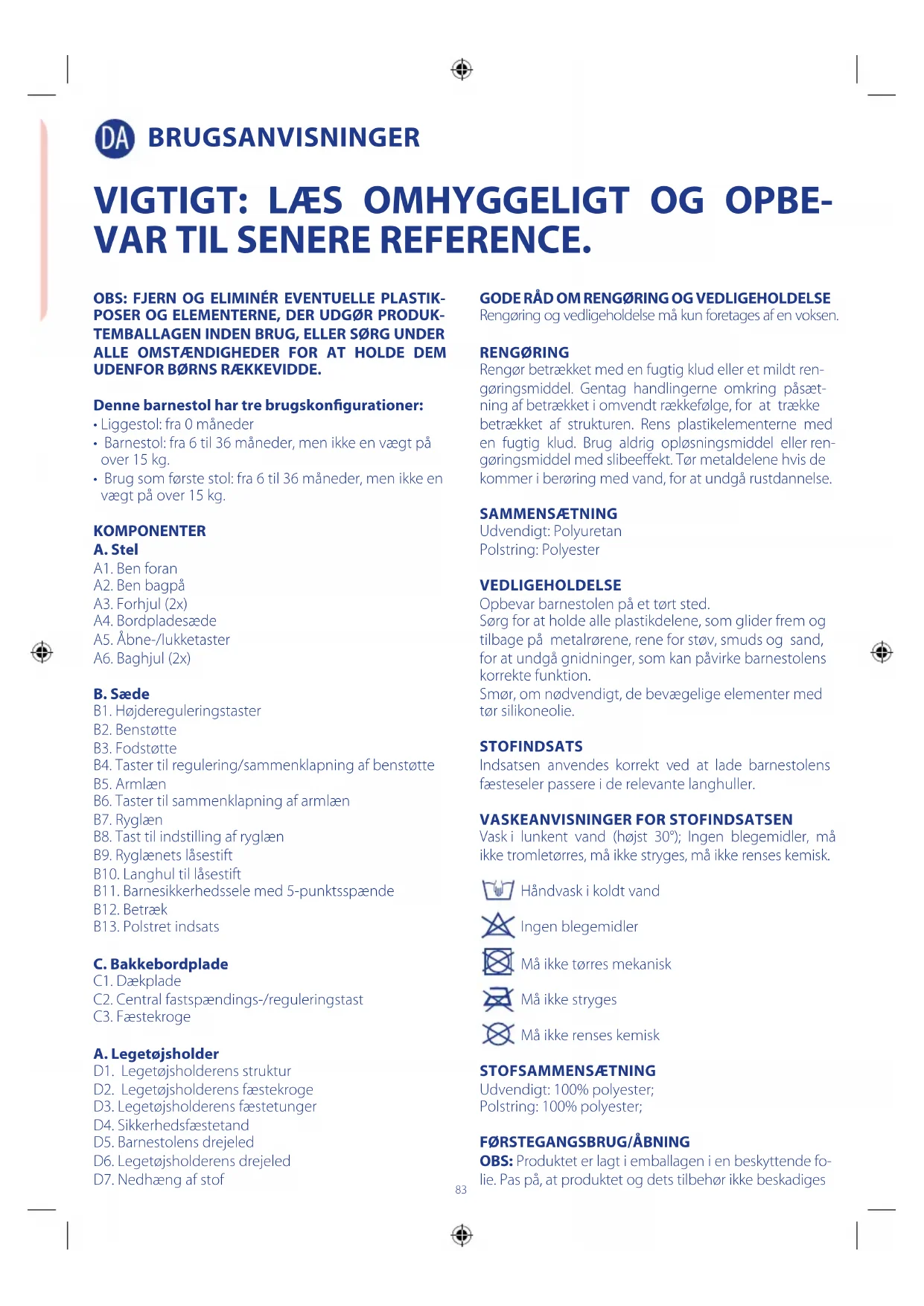 - Brug som første stol: fra 6 til 36 måneder, men ikke en vægt på over 15 kg. KOMPONENTER A. Stel A1. Ben foran A2. Ben bagpå A3. Forhjul (2x) A4. Bordpladesæde A5. Åbne-/lukketaster A6. Baghjul (2x) B. Sæde B1. Højdereguleringstaster B2. Benstøtte B3. Fodstøtte B4. Taster til regulering/sammenklapning af benstøtte B5. Armlæn B6. Taster til sammenklapning af armlæn B7. Ryglæn B8. Tast til indstilling af ryglæn B9. Ryglænets låsestift B10. Langhul til låsestift B11. Barnesikkerhedssele med 5-punktsspænde B12. Betræk B13. Polstret indsats C. Bakkebordplade C1. Dækplade C2. Central fastspændings-/reguleringstast C3. Fæstekroge A. Legetøjsholder D1. Legetøjsholderens struktur D2. Legetøjsholderens fæstekroge D3. Legetøjsholderens fæstetunger D4. Sikkerhedsfæstetand D5. Barnestolens drejeled D6. Legetøjsholderens drejeled D7. Nedhæng af stof GODE RÅD OM RENGØRING OG VEDLIGEHOLDELSE Rengøring og vedligeholdelse må kun foretages af en voksen. RENGØRING Rengør betrækket med en fugtig klud eller et mildt ren- gøringsmiddel. Gentag handlingerne omkring påsæt- ning af betrækket i omvendt rækkefølge, for at trække betrækket af strukturen. Rens plastikelementerne med en fugtig klud. Brug aldrig opløsningsmiddel eller ren- gøringsmiddel med slibeeekt. Tør metaldelene hvis de kommer i berøring med vand, for at undgå rustdannelse. SAMMENSÆTNING Udvendigt: Polyuretan Polstring: Polyester VEDLIGEHOLDELSE Opbevar barnestolen på et tørt sted. Sørg for at holde alle plastikdelene, som glider frem og tilbage på metalrørene, rene for støv, smuds og sand, for at undgå gnidninger, som kan påvirke barnestolens korrekte funktion. Smør, om nødvendigt, de bevægelige elementer med tør silikoneolie. STOFINDSATS Indsatsen anvendes korrekt ved at lade barnestolens fæsteseler passere i de relevante langhuller.