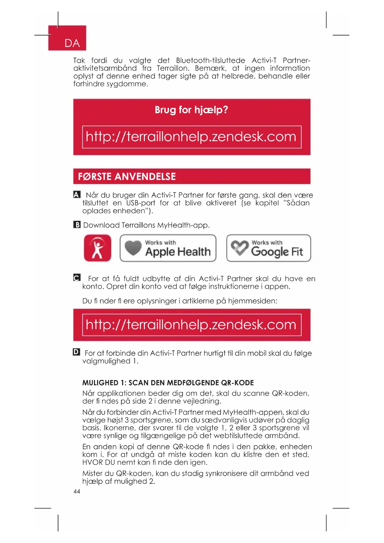 For at få fuldt udbytte af din Activi-T Partner skal du have en konto. Opret din konto ved at følge instruktionerne i appen. Du fi nder fl ere oplysninger i artiklerne på hjemmesiden: http://terraillonhelp.zendesk.com45
