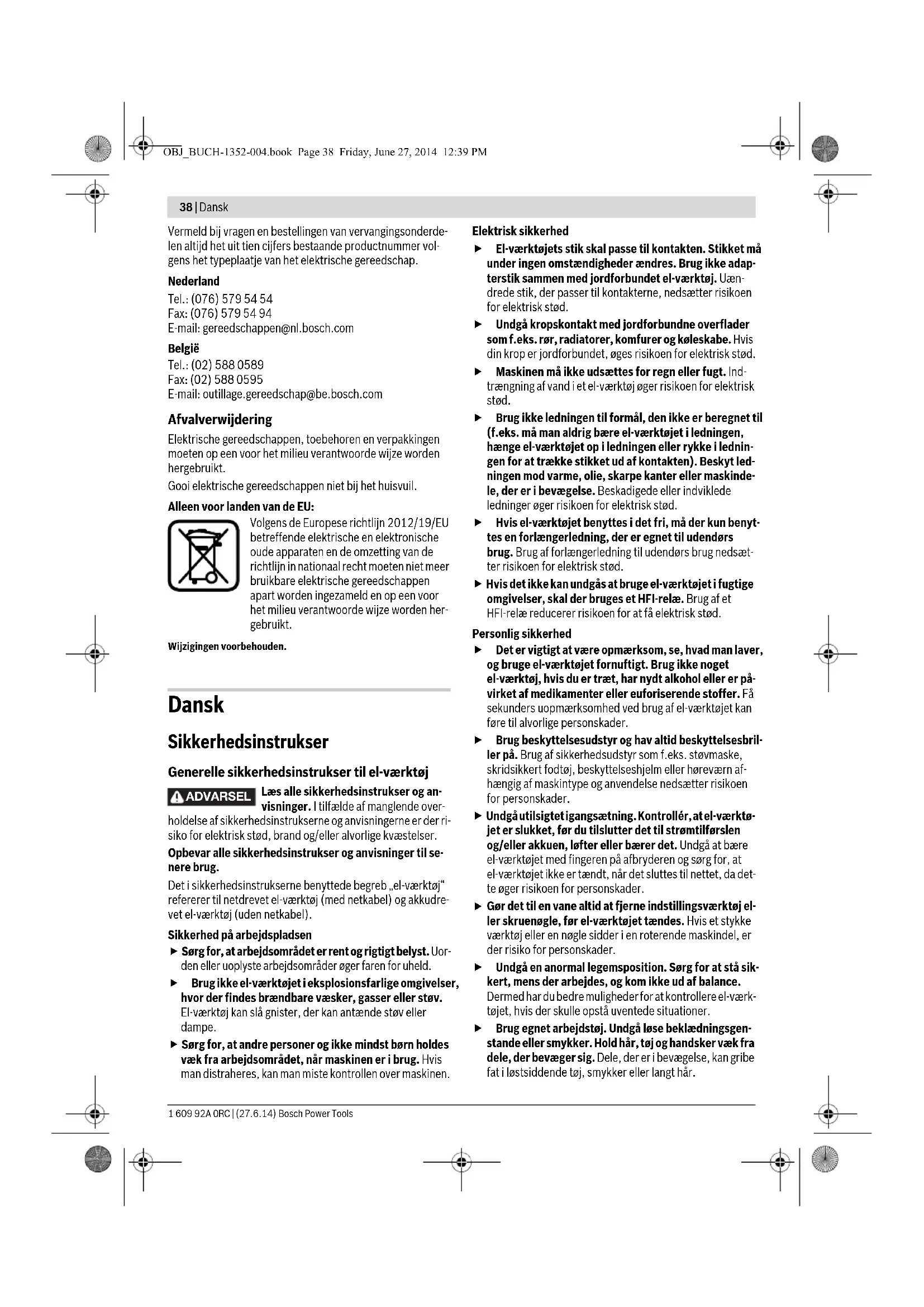 Gør det til en vane altid at fjerne indstillingsværktøj el- ler skruenøgle, før el-værktøjet tændes. Hvis et stykke værktøj eller en nøgle sidder i en roterende maskindel, er der risiko for personskader. Undgå en anormal legemsposition. Sørg for at stå sik- kert, mens der arbejdes, og kom ikke ud af balance. Dermed har du bedre muligheder for at kontrollere el-værk- tøjet, hvis der skulle opstå uventede situationer. Brug egnet arbejdstøj. Undgå løse beklædningsgen- stande eller smykker. Hold hår, tøj og handsker væk fra dele, der bevæger sig. Dele, der er i bevægelse, kan gribe fat i løstsiddende tøj, smykker eller langt hår. ADVARSEL OBJ_BUCH-1352-004.book Page 38 Friday, June 27, 2014 12:39 PMDansk | 39 Bosch Power Tools 1 609 92A 0RC | (27.6.14) Hvis støvudsugnings- og opsamlingsudstyr kan monte- res, er det vigtigt, at dette tilsluttes og benyttes kor- rekt. Brug af en støvopsugning kan reducere støvmæng- den og dermed den fare, der er forbundet støv. Omhyggelig omgang med og brug af el-værktøj Undgå overbelastning af maskinen. Brug altid et el-værktøj, der er beregnet til det stykke arbejde, der skal udføres. Med det passende el-værktøj arbejder man bedst og mest sikkert inden for det angivne effektområde. Brug ikke et el-værktøj, hvis afbryder er defekt. Et el-værktøj, der ikke kan startes og stoppes, er farlig og skal repareres. Træk stikket ud af stikkontakten og/eller fjern akkuen, inden maskinen indstilles, der skiftes tilbehørsdele, el- ler maskinen lægges fra. Disse sikkerhedsforanstaltnin- ger forhindrer utilsigtet start af el-værktøjet. Opbevar ubenyttet el-værktøj uden for børns række- vidde. Lad aldrig personer, der ikke er fortrolige med maskinen eller ikke har gennemlæst disse instrukser, benytte maskinen. El-værktøj er farligt, hvis det benyttes af ukyndige personer. El-værktøjet bør vedligeholdes omhyggeligt. Kontroller, om bevægelige maskindele fungerer korrekt og ikke sid- der fast, og om delene er brækket eller beskadiget, såle- des at el-værktøjets funktion påvirkes. Få beskadigede dele repareret, inden maskinen tages i brug. Mange uheld skyldes dårligt vedligeholdte el-værktøjer. Sørg for, at skæreværktøjer er skarpe og rene. Omhyg- geligt vedligeholdte skæreværktøjer med skarpe skære- kanter sætter sig ikke så hurtigt fast og er nemmere at føre. Brug el-værktøj, tilbehør, indsatsværktøj osv. iht. dis- se instrukser. Tag hensyn til arbejdsforholdene og det arbejde, der skal udføres. Anvendelse af el-værktøjet til formål, som ligger uden for det fastsatte anvendelsesom- råde, kan føre til farlige situationer. Service Sørg for, at el-værktøj kun repareres af kvalificerede fagfolk og at der kun benyttes originale reservedele. Dermed sikres størst mulig maskinsikkerhed. Sikkerhedsinstrukser til bajonetsave Hold el-værktøjet i de isolerede gribeflader, når du ud- fører arbejde, hvor indsatsværktøjet kan ramme bøje- de strømledninger eller el-værktøjets eget kabel. Kon- takt med en spændingsførende ledning kan også sætte maskinens metaldele under spænding, hvilket kan føre til elektrisk stød. Hold hænderne væk fra saveområdet. Stik ikke fingre- ne ind under emnet. Du kan blive kvæstet, hvis du kom- mer i kontakt med savklingen. El-værktøjet skal altid være tændt, når det føres hen til emnet. Ellers er der fare for tilbageslag, hvis indsatsværk- tøjet sætter sig fast i emnet. Kontrollér, at fodpladen 2 altid ligger sikkert på emnet under savearbejdet Savklingen kan sætte sig i klemme, hvilket kan medføre, at man taber kontrollen over el-værk- tøjet. Sluk for el-værktøjet, når du er færdig med at save, og træk først savklingen ud af snittet, når den står helt stille. Således undgås tilbageslag, desuden kan el-værktø- jet lægges sikkert fra. Anvend kun ubeskadigede, fejlfrie savklinger. Bøjede eller uskarpe savklinger kan brække, påvirke snittet nega- tivt eller føre til tilbageslag. Forsøg ikke at bremse savklingen ved at trykke den ind i siden, efter den er blevet slukket. Savklingen kan be- skadiges, brække eller føre til tilbageslag. Spænd materialet godt fast. Støt ikke emnet med hån- den eller foden. Berør ikke genstande eller jorden med saven, når saven er i gang. Fare for tilbageslag. Anvend egnede søgeinstrumenter til at finde frem til skjulte forsyningsledninger eller kontakt det lokale forsyningsselskab. Kontakt med elektriske ledninger kan føre til brand og elektrisk stød. Beskadigelse af en gasled- ning kan føre til eksplosion. Brud på et vandrør kan føre til materiel skade eller elektrisk stød. Hold altid maskinen fast med begge hænder og sørg for at stå sikkert under arbejdet. El-værktøjet føres sikkert med to hænder. Sikr emnet. Et emne holdes bedre fast med spændean- ordninger eller skruestik end med hånden. El-værktøjet må først lægges fra, når det står helt stil- le. Indsatsværktøjet kan sætte sig i klemme, hvilket kan medføre, at man taber kontrollen over el-værktøjet. Beskrivelse af produkt og ydelse Læs alle sikkerhedsinstrukser og anvisnin- ger. I tilfælde af manglende overholdelse af sikkerhedsinstrukserne og anvisningerne er der risiko for elektrisk stød, brand og/eller alvorlige kvæstelser. Beregnet anvendelse Maskinen er beregnet til – med fast anslag – at save i træ, kunststof, metal og byggematerialer. Den er egnet til lige snit og kurvesnit. Brug af egnede bimetal-klinger gør det muligt at save fremstående emner som vandrør, jernrør osv. plan med væggen. Benyt de anbefalede savklinger. Illustrerede komponenter Nummereringen af de illustrerede komponenter refererer til illustrationen af el-værktøjet på illustrationssiden. 1 Savklinge* 2 Fodplade 3 Savklingeholder 4 Hopstang 5 SDS-arm til savklingeåbning 6 Start-stop-kontakt 7 Håndgreb (isoleret gribeflade) 8 Klemmeplade *Tilbehør, som er illustreret og beskrevet i brugsanvisningen, er ikk
