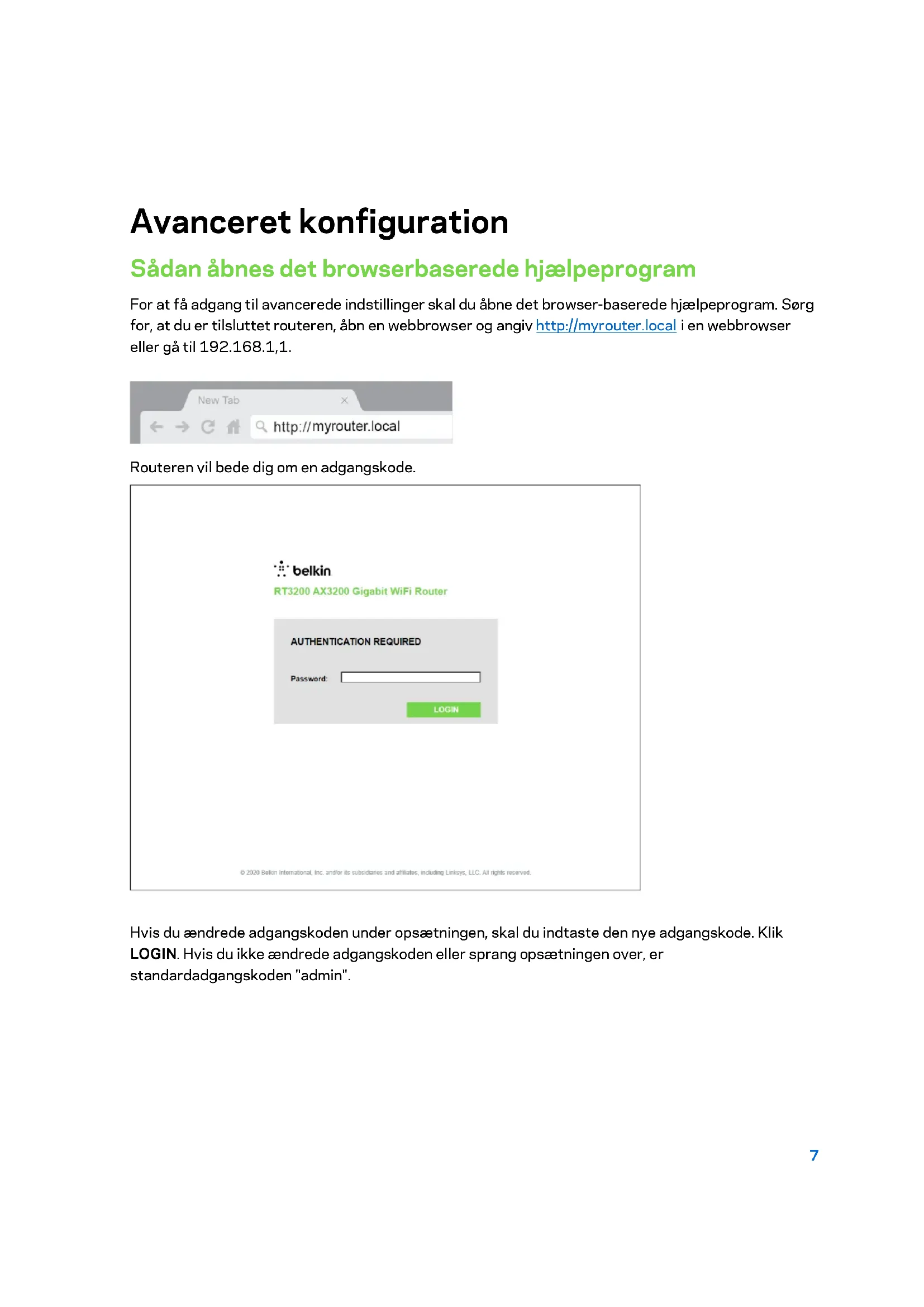 kan holde dig underrettet om sikkerhedsopdateringer, produkttilbagekaldelser og andre ting, der vil forbedre din oplevelse.7 Avanceret konfiguration Sådan åbnes det browserbaserede hjælpeprogram For at få adgang til avancerede indstillinger skal du åbne det browser-baserede hjælpeprogram. Sørg for, at du er tilsluttet routeren, åbn en webbrowser og angiv http://myrouter.local i en webbrowser eller gå til 192.168.1,1. Routeren vil bede dig om en adgangskode. Hvis du ændrede adgangskoden under opsætningen, skal du indtaste den nye adgangskode. Klik LOGIN. Hvis du ikke ændrede adgangskoden eller sprang opsætningen over, er standardadgangskoden "admin".8 Grundlæggende routerindstillinger Denne skærm giver mulighed for at ændre routerens basale konfiguration.9 Sprog Vælg dit sprog – for at ændre sprog, vælg et i rullemenuen. Sproget i det browserbaserede hjælpeprogram vil skifte indenfor fem sekunder.10 Internetopsætning Internetkonfigurationenssektionen konfigurerer routeren til din internetforbindelse. Disse oplysninger kan fås via din internetudbyder. Internetforbindelsestype - -- vælg den type internetforbindelse, som din internetudbyder anvender, på rullemenuen.