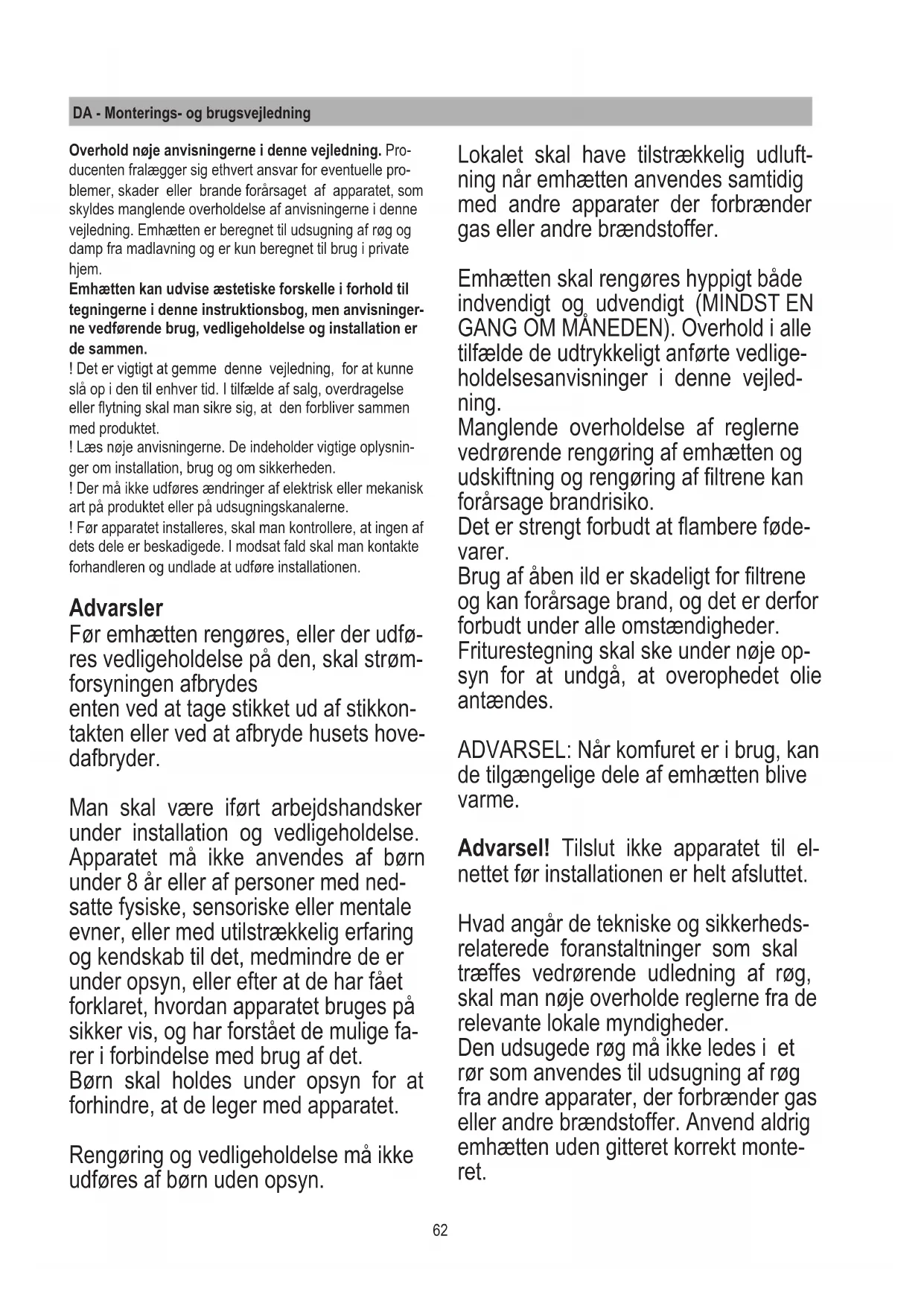 Etter at den uttrekkbare vognen er åp- net, kan du styre avtrekksmotoren med tastaturet, som forklart nedenfor. Du lukker panelet på samme måte. Try- kk på frontglasset til vognen lukkes helt. T1. T2. T3. Tasten ON/OFF timer: Trykk for å programmere au- tomatisk slukking: Hastighet 1: 20 minutter Hastighet 2: 15 minutter Hastighet 3: 10 minutter Intens hastighet: 5 minutter Tast for å redusere avtrekkshastigheten (effekten). OFF 1: Trykk ere ganger for å redusere hastigheten helt til hetten slukkes. OFF 2: Trykk og hold ved hvilken som helst hastighet. Tast for ON / øk avtrekkshastighet (effekt) (1, 2, 3 og intens). Intens hastighet varer ca. 5 minutter. Deretter går hetten automatisk over til hastighet 2.61 Indikator for mettet lter Hetten indikerer når du må vedlikeholde ltrene: Fettltre (ca. hver 40. driftstime): Alle dioder lyser blått. Kullltre (ca. hver 160. driftstime): Alle dioder lyser blått. Diode L2 og L3 blinker. Tilbakestill varsel om mettet lter Etter at du har vedlikeholdt ltrene, trykker du lenge på ta- stene T1 og T3. Diodene L1, L2 og L3 blinker kort blått og slukkes. Aktivere indikator for mettet kulllter Denne indikatoren er vanligvis deaktivert. Slik aktiverer du den: Slå av hetten. Trykk og holde inne tastene T1 og T2 sam- tidig. Først tennes dioden L1, deretter L2 og L3. Når du slipper tastene, blinker diodene L2 og L3 kort for å vise at aktiveringen er fullført. Deaktivere indikator for mettet kulllter: Gjenta ope- rasjonen ovenfor. Først tennes diodene L1, L2 og L3 sam- tidig. Når du slipper tastene, slukkes L2 og L3 for å vise at deaktiveringen er fullført. VEDLIKEHOLD Fettlter Tar opp fett fra matos. Skal rengjøres med et mildt vaskemiddel en gang i måne- den, eller når indikatoren for mettet fettlter indikerer det (hvis modellen har dette). Filteret vaskes for hånd eller i oppvaskmaskin på lav temperatur og kort program. Fettlteret kan misfarges i oppvaskmaskinen, men ltrerer like godt som før. Kulllteret (bare for lterversjon) fanger opp lukt fra matos. Kulllteret mettes over tid, og varigheten avhenger av hvor- dan du lager mat og hvor ofte du rengjør fettlteret. Filteret skal i alle tilfeller skiftes ut minst hver fjerde måned. Når du har fjernet fettlteret, kan du sette inn kullltrene (g. 8).62 DA - Monterings- og brugsvejledning Overhold nøje anvisningerne i denne vejledning. Pro- ducenten fralægger sig ethvert ansvar for eventuelle pro- blemer, skader eller brande forårsaget af apparatet, som skyldes manglende overholdelse af anvisningerne i denne vejledning. Emhætten er beregnet til udsugning af røg og damp fra madlavning og er kun beregnet til brug i private hjem. Emhætten kan udvise æstetiske forskelle i forhold til tegningerne i denne instruktionsbog, men anvisninger- ne vedførende brug, vedligeholdelse og installation er de sammen. ! Det er vigtigt at gemme denne vejledning, for at kunne slå op i den til enhver tid. I tilfælde af salg, overdragelse eller ytning skal man sikre sig, at den forbliver sammen med produktet. ! Læs nøje anvisningerne. De indeholder vigtige oplysnin- ger om installation, brug og om sikkerheden. ! Der må ikke udføres ændringer af elektrisk eller mekanisk art på produktet eller på udsugningskanalerne. ! Før apparatet installeres, skal man kontrollere, at ingen af dets dele er beskadigede. I modsat fald skal man kontakte forhandleren og undlade at udføre installationen. Advarsler Før emhætten rengøres, eller der udfø- res vedligeholdelse på den, skal strøm- forsyningen afbrydes enten ved at tage stikket ud af stikkon- takten eller ved at afbryde husets hove- dafbryder. Man skal være iført arbejdshandsker under installation og vedligeholdelse. Apparatet må ikke anvendes af børn under 8 år eller af personer med ned- satte fysiske, sensoriske eller mentale evner, eller med utilstrækkelig erfaring og kendskab til det, medmindre de er under opsyn, eller efter at de har fået forklaret, hvordan apparatet bruges på sikker vis, og har forstået de mulige fa- rer i forbindelse med brug af det. Børn skal holdes under opsyn for at forhindre, at de leger med apparatet. Rengøring og vedligeholdelse må ikke udføres af børn uden opsyn. Lokalet skal have tilstrækkelig udluft- ning når emhætten anvendes samtidig med andre apparater der forbrænder gas eller andre brændstoffer. Emhætten skal rengøres hyppigt både indvendigt og udvendigt (MINDST EN GANG OM MÅNEDEN). Overhold i alle tilfælde de udtrykkeligt anførte vedlige- holdelsesanvisninger i denne vejled- ning. Manglende overholdelse af reglerne vedrørende rengøring af emhætten og udskiftning og rengøring af ltrene kan forårsage brandrisiko. Det er strengt forbudt at ambere føde- varer. Brug af åben ild er skadeligt for ltrene og kan forårsage brand, og det er derfor forbudt under alle omstændigheder. Friturestegning skal ske under nøje op- syn for at undgå, at overophedet olie antændes. ADVARSEL: Når komfuret er i brug, kan de tilgængelige dele af emhætten blive varme. Advarsel! Tilslut ikke apparatet til el- nettet før installationen er helt afsluttet. Hvad angår de tekniske og sikkerheds- relaterede foranstaltninger som skal træffes vedrørende udledning af røg, skal man nøje overholde reglerne fra de relevante lokale myndigheder. Den udsugede røg må ikke ledes i et rør som anvendes til udsugning af røg fra andre apparater, der forbrænder gas eller andre brændstoffer. Anvend aldrig emhætten uden gitteret korrekt monte- ret.63 Emhætten må ALDRIG anvendes som støtteade, medmindre andet udtrykke- ligt er angivet. Anvend kun fastgøringsskruerne leve- ret sammen med produktet til installa- tion. Køb den korrekte type skrue, hvis de ikke medfølger, Anvend skruer med den korrekte længde, som anvist i in- stallationsvejledningen. I tvivlstilfælde skal man kontakte et autoriseret servi- ceværksted eller lignende kvaliceret personale. VIGTIGT! Såfremt skruerne og fa- stgøringsanordn