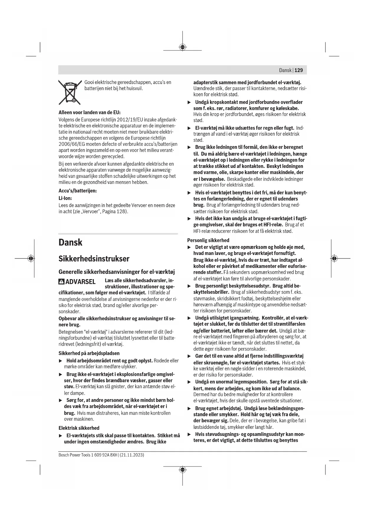 Bluetooth® Low Energy ModuleGCY42 niet standaard bij de levering inbegrepen Connectivity-functies (GWS18V-15 C / GWS18V-15 SC/ GWS18V-15 PSC) In combinatie met de Bluetooth® Low Energy ModuleGCY42 (niet standaard bij de levering inbegrepen) staan de volgende Connectivity-functies voor het elektrische gereedschap ter beschikking: – registratie en persoonlijke instelling – statuscontrole, geven van waarschuwingsmeldingen – algemene informatie en instellingen – beheer Lees voor informatie over de Bluetooth® Low Energy ModuleGCY42 (niet standaard bij de levering inbegrepen) de bijbehorende gebruiksaanwijzing. De verbinding van het elektrische gereedschap met de app moet worden bevestigd door op de toets toerentalinstelling (39) op de gebruikersinterface (4) te drukken. De app vraagt hierom bij het verbinden. Onderhoud en service Onderhoud en reiniging u Neem vóór alle werkzaamheden aan het elektrische gereedschap (zoals het uitvoeren van onderhoud of het wisselen van inzetgereedschappen e.d.) en vóór het vervoeren en opbergen altijd de accu uit het elek- trische gereedschap. Bij per ongeluk bedienen van de aan/uit-schakelaar bestaat gevaar voor letsel. u Houd het elektrische gereedschap en de ventilatie- openingen altijd schoon om goed en veilig te werken. Bewaar en behandel de accessoires zorgvuldig. Klantenservice en gebruiksadvies Onze klantenservice beantwoordt uw vragen over reparatie en onderhoud van uw product en over vervangingsonderde- len. Explosietekeningen en informatie over vervangingson- derdelen vindt u ook op: www.bosch-pt.com Het Bosch-gebruiksadviesteam helpt u graag bij vragen over onze producten en accessoires. Vermeld bij vragen en bestellingen van vervangingsonderde- len altijd het uit tien cijfers bestaande productnummer vol- gens het typeplaatje van het product. Nederland Tel.: (076) 579 54 54 Fax: (076) 579 54 94 E-mail: gereedschappen@nl.bosch.com Meer serviceadressen vindt u onder: www.bosch-pt.com/serviceaddresses Vervoer Op de aanbevolen Li-Ion-accu’s zijn de eisen voor het ver- voer van gevaarlijke stoffen van toepassing. De accu’s kun- nen door de gebruiker zonder verdere voorwaarden over de weg vervoerd worden. Bij de verzending door derden (bijv. luchtvervoer of expedi- tiebedrijf) moeten bijzondere eisen ten aanzien van verpak- king en markering in acht genomen worden. In deze gevallen moet bij de voorbereiding van de verzending een deskundige voor gevaarlijke stoffen geraadpleegd worden. Verzend accu’s alleen, wanneer de behuizing onbeschadigd is. Plak blootliggende contacten af en verpak de accu zoda- nig dat deze niet in de verpakking beweegt. Neem ook even- tuele overige nationale voorschriften in acht. Afvalverwijdering Elektrische gereedschappen, accu’s, accessoi- res en verpakkingen moeten op een voor het milieu verantwoorde wijze gerecycled worden. 1 609 92A 8XH | (21.11.2023) Bosch Power ToolsDansk | 129 Gooi elektrische gereedschappen, accu’s en batterijen niet bij het huisvuil. Alleen voor landen van de EU: Volgens de Europese richtlijn 2012/19/EU inzake afgedank- te elektrische en elektronische apparatuur en de implemen- tatie in nationaal recht moeten niet meer bruikbare elektri- sche gereedschappen en volgens de Europese richtlijn 2006/66/EG moeten defecte of verbruikte accu’s/batterijen apart worden ingezameld en op een voor het milieu verant- woorde wijze worden gerecycled. Bij een verkeerde afvoer kunnen afgedankte elektrische en elektronische apparaten vanwege de mogelijke aanwezig- heid van gevaarlijke stoffen schadelijke uitwerkingen op het milieu en de gezondheid van mensen hebben. Accu's/batterijen: Li-Ion: Lees de aanwijzingen in het gedeelte Vervoer en neem deze in acht (zie „Vervoer“, Pagina128). Dansk Sikkerhedsinstrukser Generelle sikkerhedsanvisninger for el-værktøj ADVARSEL Læs alle sikkerhedsadvarsler, in- struktioner, illustrationer og spe- cifikationer, som følger med el-værktøjet. I tilfælde af manglende overholdelse af anvisningerne nedenfor er der ri- siko for elektrisk stød, brand og/eller alvorlige per- sonskader. Opbevar alle sikkerhedsinstrukser og anvisninger til se- nere brug. Betegnelsen "el-værktøj" i advarslerne refererer til dit (led- ningsforbundne) el-værktøj tilsluttet lysnettet eller til batte- ridrevet (ledningsfrit) el-værktøj. Sikkerhed på arbejdspladsen u Hold arbejdsområdet rent og godt oplyst. Rodede eller mørke områder kan medføre ulykker. u Brug ikke el‑værktøjet i eksplosionsfarlige omgivel- ser, hvor der findes brændbare væsker, gasser eller støv. El‑værktøj kan slå gnister, der kan antænde støv el- ler dampe. u Sørg for, at andre personer og ikke mindst børn hol- des væk fra arbejdsområdet, når el-værktøjet er i brug. Hvis man distraheres, kan man miste kontrollen over maskinen. Elektrisk sikkerhed u El‑værktøjets stik skal passe til kontakten. Stikket må under ingen omstændigheder ændres. Brug ikke adapterstik sammen med jordforbundet el‑værktøj. Uændrede stik, der passer til kontakterne, nedsætter risi- koen for elektrisk stød. u Undgå kropskontakt med jordforbundne overflader som f. eks. rør, radiatorer, komfurer og køleskabe. Hvis din krop er jordforbundet, øges risikoen for elektrisk stød. u El-værktøj må ikke udsættes for regn eller fugt. Ind- trængen af vand i el‑værktøj øger risikoen for elektrisk stød. u Brug ikke ledningen til formål, den ikke er beregnet til. Du må aldrig bære el‑værktøjet i ledningen, hænge el‑værktøjet op i ledningen eller rykke i ledningen for at trække stikket ud af kontakten. Beskyt ledningen mod varme, olie, skarpe kanter eller maskindele, der er i bevægelse. Beskadigede eller indviklede ledninger øger risikoen for elektrisk stød. u Hvis el‑værktøjet benyttes i det fri, må der kun benyt- tes en forlængerledning, der er egnet til udendørs brug. Brug af forlængerledning til udendørs brug ned- sætter risikoen for elektrisk stød. u Hvis det ikk