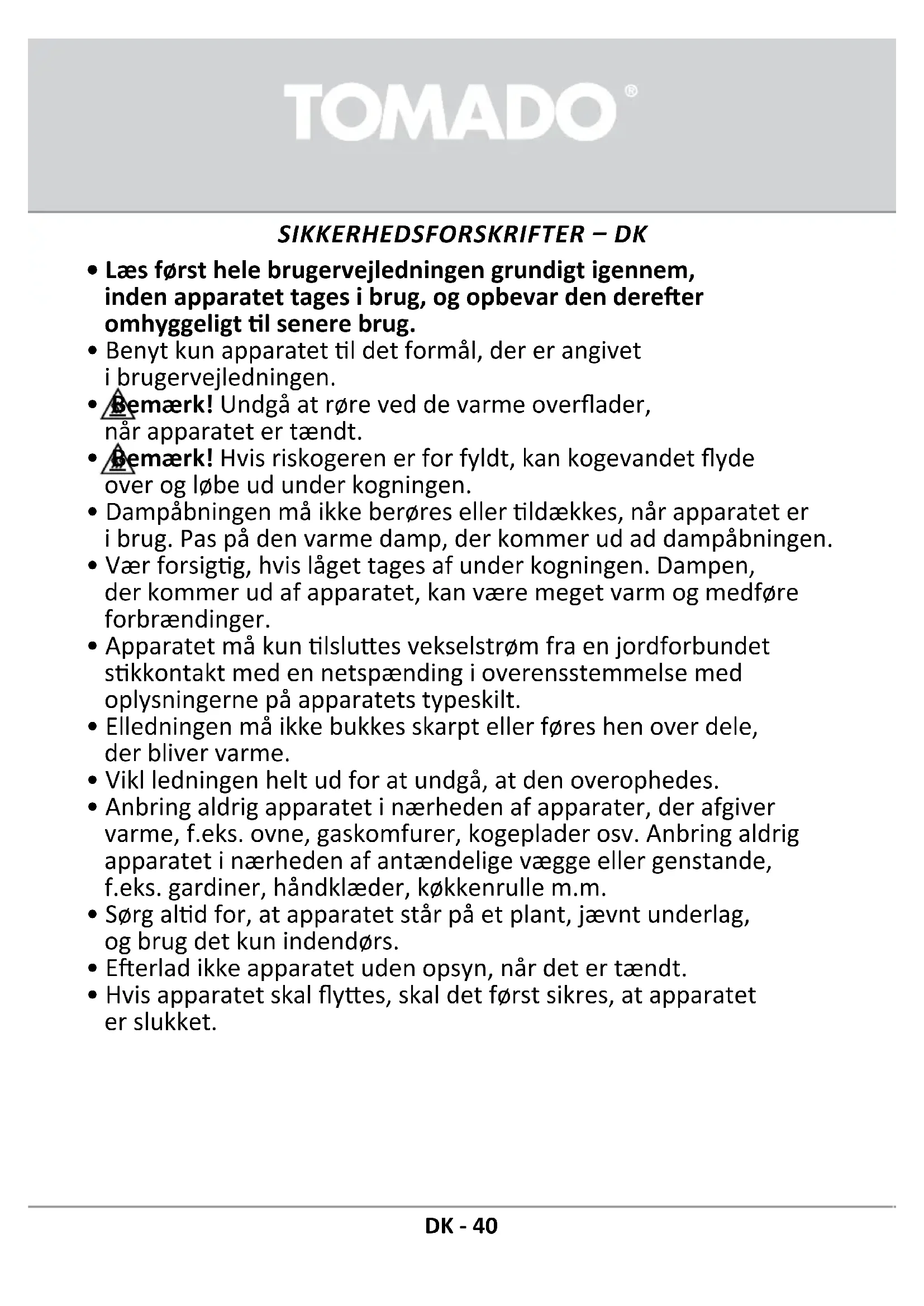 På dee produkt gives 24 måneders garan. Garanen dækker, såfremt produktet anvendes i overensstemmelse med brugervejledningen og det lsigtede formål. Der skal ligeledes forevises originalkviering, som skal indeholde købsdato, forhandlerens navn og produktets varenummer. Garanbengelserne kan læses i deres fulde længde på vores hjemmeside: www.tomado.com/support. GARANTIBETINGELSER