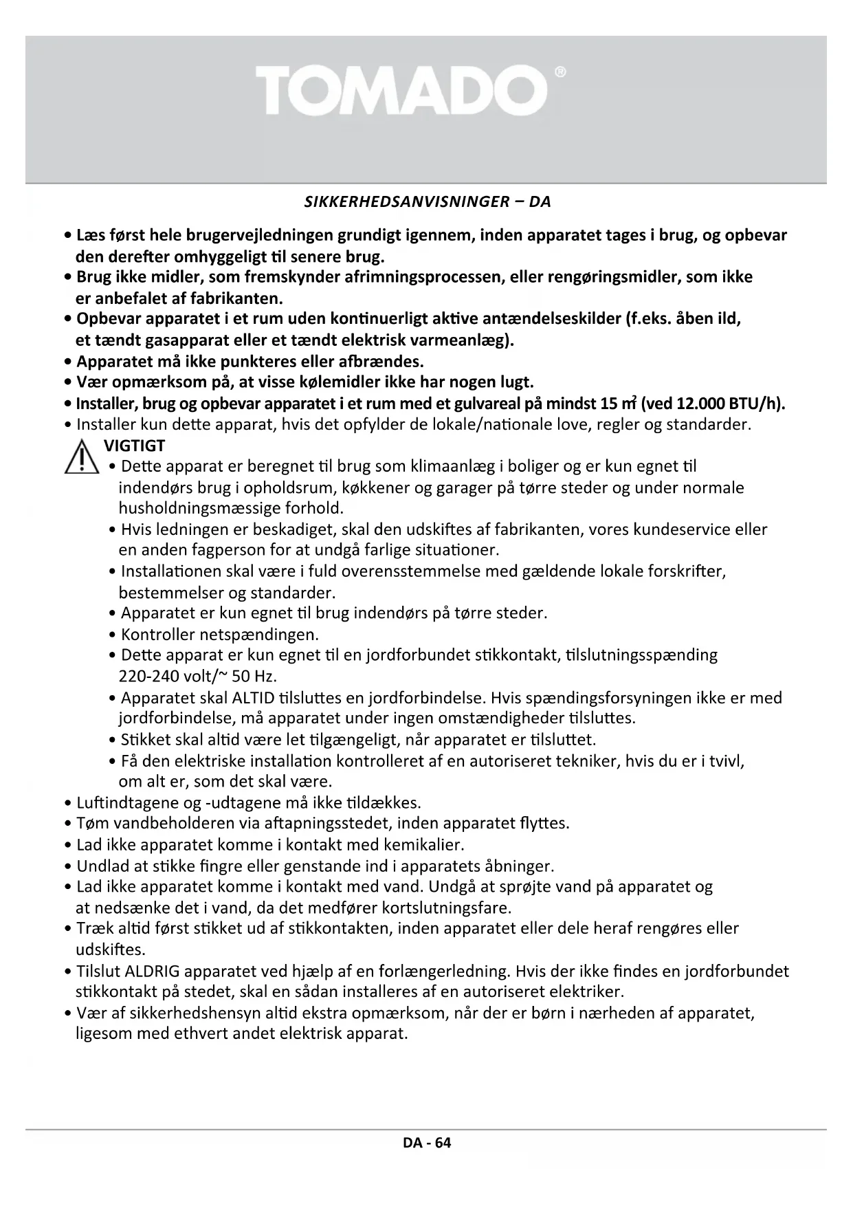 På dee produkt gives 24 måneders garan. Garanen dækker, såfremt produktet anvendes i overensstemmelse med brugervejledningen og det lsigtede formål. Der skal ligeledes forevises originalkviering, som skal indeholde købsdato, forhandlerens navn og produktets varenummer. Garanbengelserne kan læses i deres fulde længde på vores hjemmeside: www.tomado. com/support. GARANTIBETINGELSER