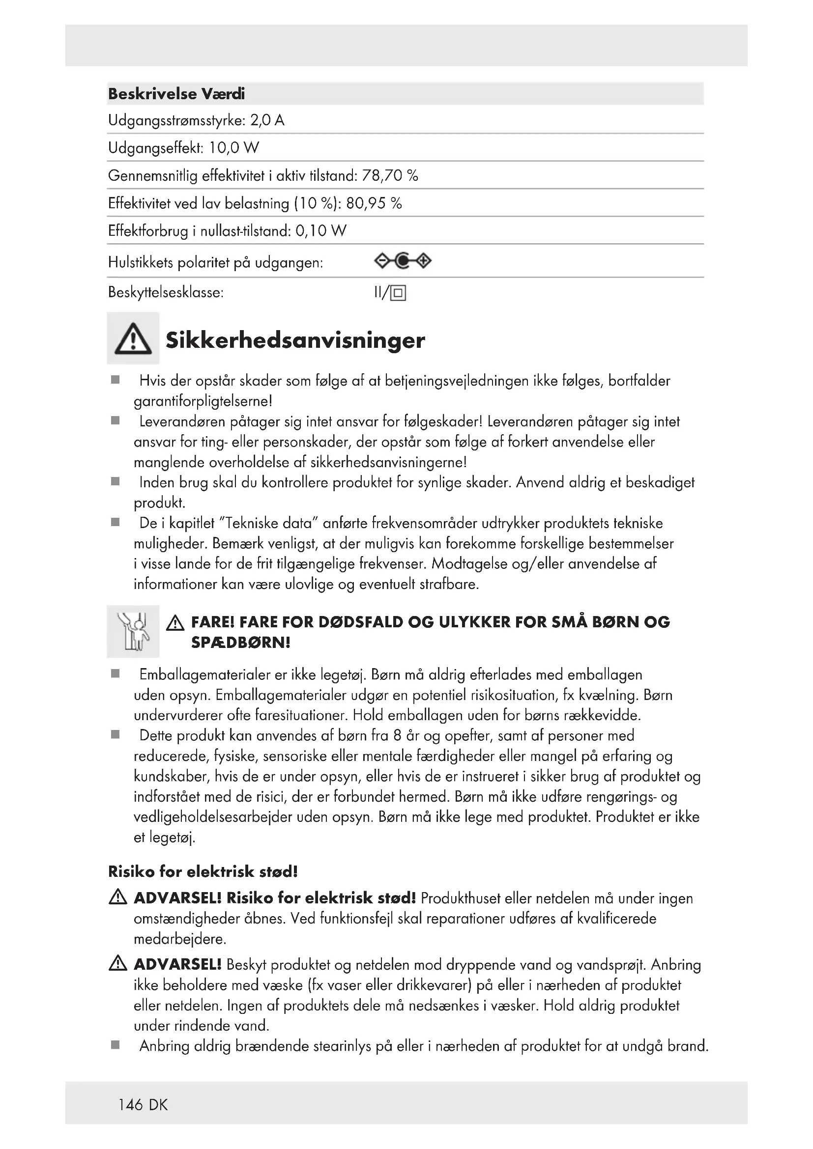 ADVARSEL! Risiko for elektrisk stød! Produkthuset eller netdelen må under ingen omstændigheder åbnes. Ved funktionsfejl skal reparationer udføres af kvalificerede medarbejdere.
