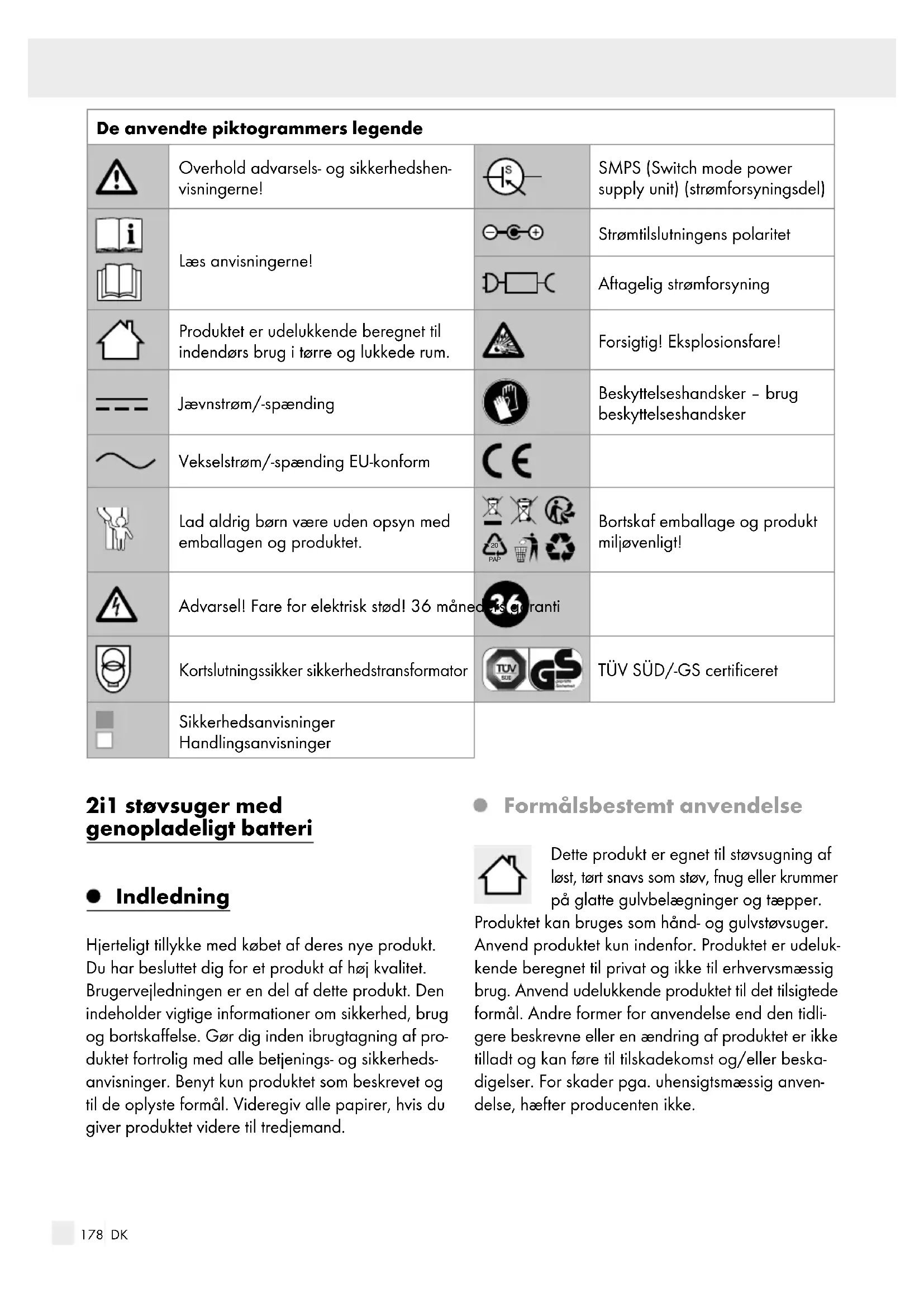 Produkt kan bruges som hand- og gulvstøvsuger. Anvend produit kan indenfor. Produktet er udelukkende beregnet til privat og/DDke til erhvervsmaessig brug. Anvend udelukkende produit til det tilsigtede formål. Andre former for anvendelse end den tidligere beskreve eller en aendring af produit er/DDke tilladt og kan fore til tilskadekomst og/eller beskadigelser. For skader pga. uhensigtsmaesig anvendelse, hæfter producenten/DDke.