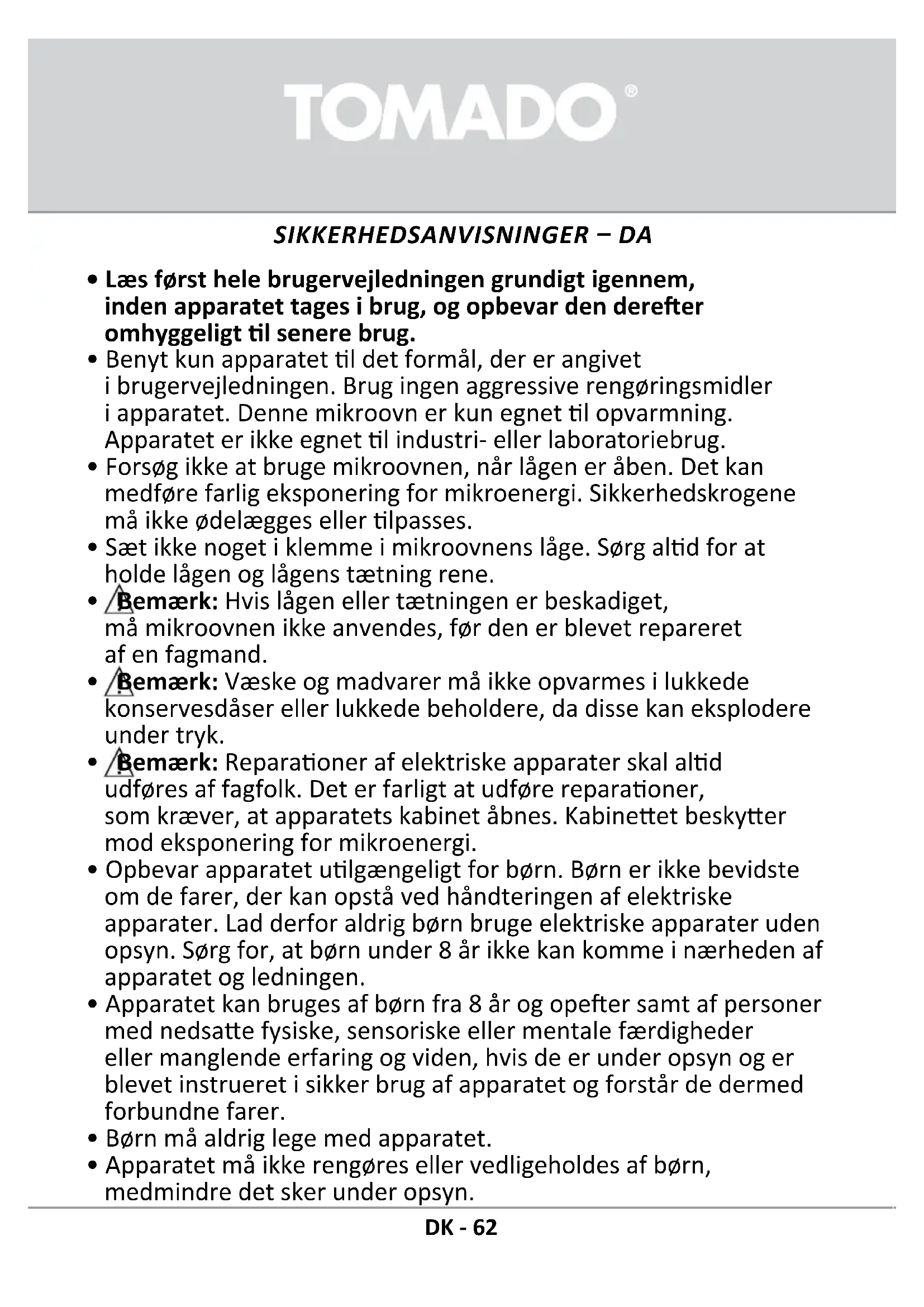 Pådeeproduktgives24månedersgaran.Garanendækker,såfremtproduktetanvendesioverensstemmelsemed brugervejledningenogdetlsigtedeformål.Derskalligeledesforevisesoriginalkviering,somskalindeholdekøbsdato, forhandlerensnavnogproduktetsvarenummer.Garanbengelsernekanlæsesideresfuldelængdepåvoreshjemmeside: www.tomado.com/support. GARANTIBETINGELSER Akcesorialubczęścizamiennemożnazamawiaćnastronieinternetowej:www.tomado.com/support.