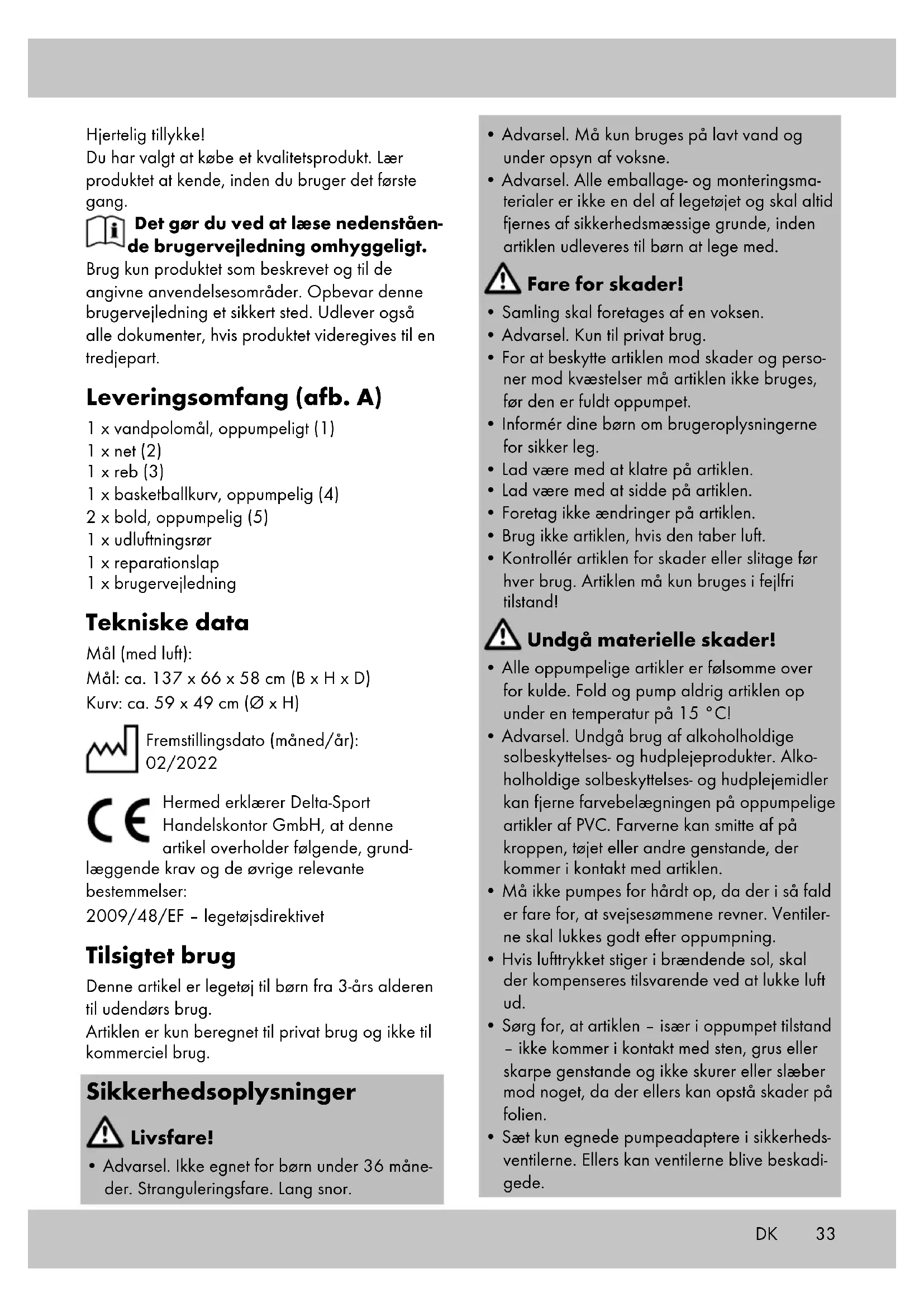 - For at beskytte artiklen mod skader og perso- ner mod kvæstelser må artiklen ikke bruges, før den er fuldt oppumpet.