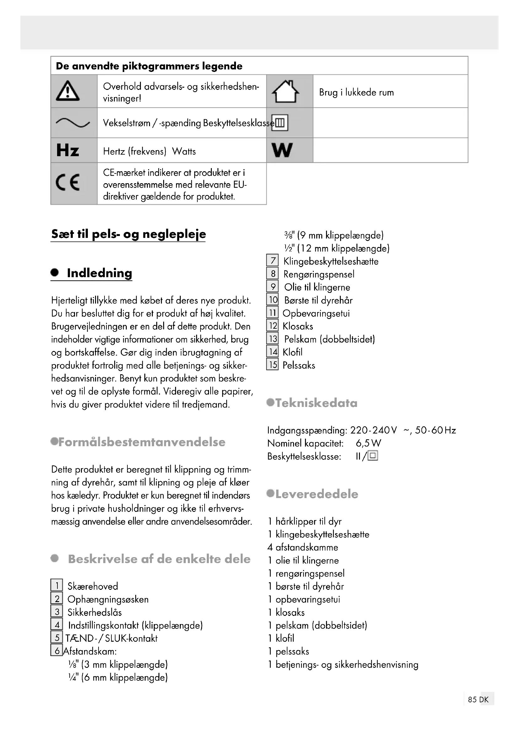 , 50 - 60 Hz Nominel kapacitet: 6,5 W Beskyttelsesklasse: II / Leverede dele 1 hårklipper til dyr 1 klingebeskyttelseshætte 4 afstandskamme 1 olie til klingerne 1 rengøringspensel 1 børste til dyrehår 1 opbevaringsetui 1 klosaks 1 pelskam (dobbeltsidet) 1 klofil 1 pelssaks 1 betjenings- og sikkerhedshenvisning86 DK Sikkerhedshen- visninger