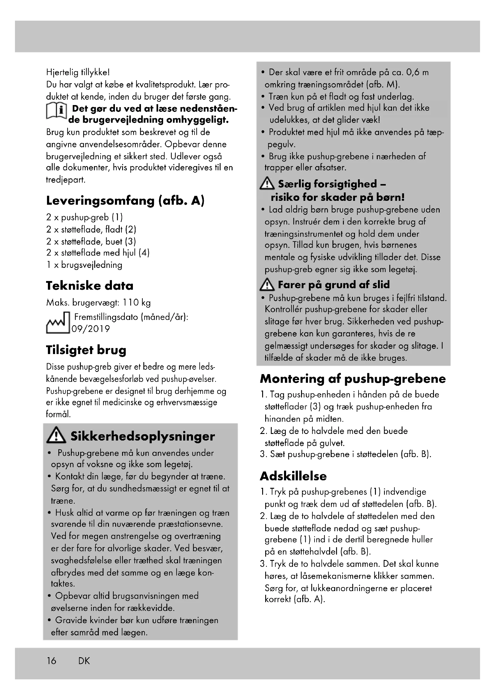 - Pushup-grebene må kun bruges i fejlfri tilstand. Kontrollér pushup-grebene for skader eller slitage før hver brug. Sikkerheden ved pushup- grebene kan kun garanteres, hvis de re gelmæssigt undersøges for skader og slitage. I tilfælde af skader må de ikke bruges. Montering af pushup-grebene