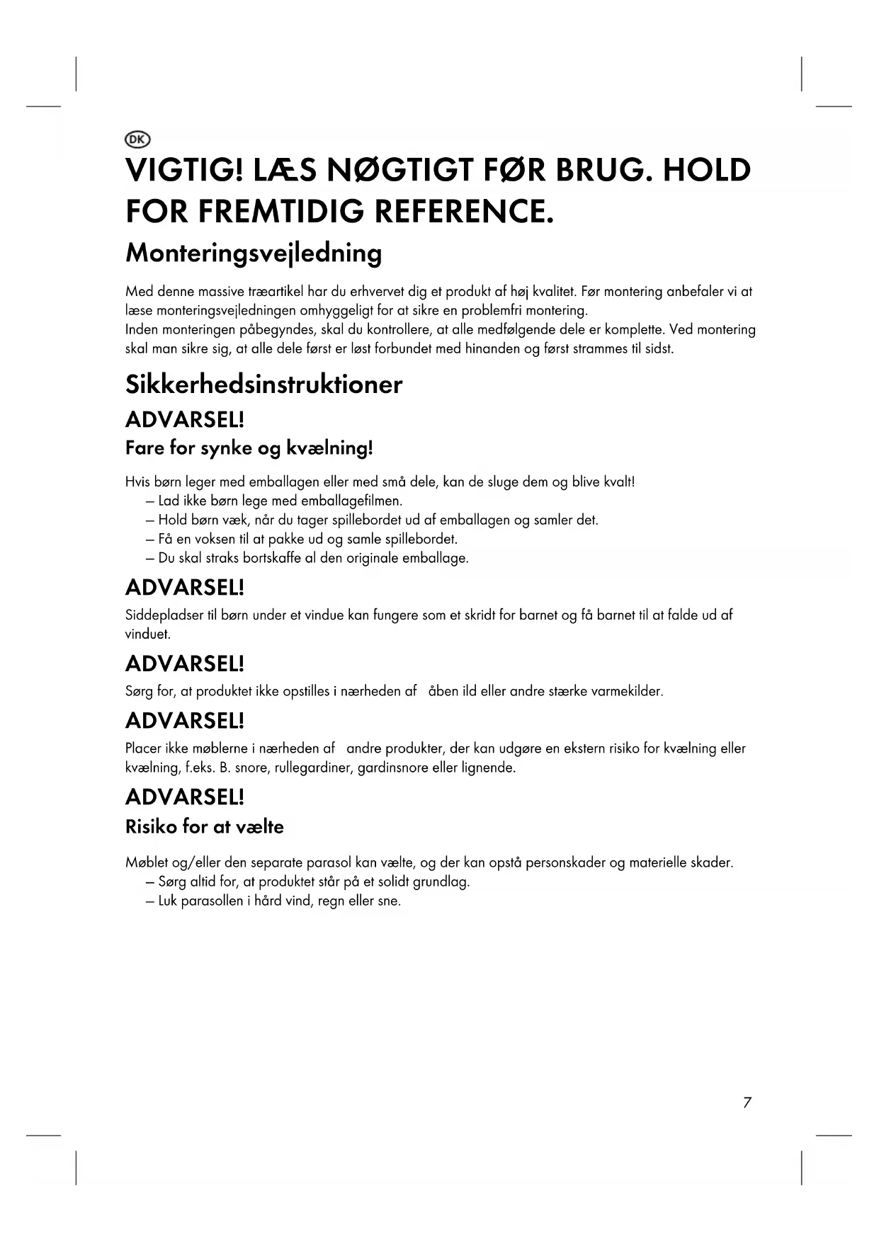 - Sæderne i børnesædesættet kan belastes med maksimalt 80 kg og bordet med maksimalt 70 kg. OBS! Monteringen må kun udføres af voksne. Brug venligst det medfølgende værktøj til montering. Bemærk Produktets design svarer til DIN EN 17191: 2019-07.9 Vedligeholdelsesinstruktioner Under brug skal skruer strammes i ny og næ, så alt sidder sikkert og intet vakler. Børnesædet er lavet af massivt træ. I et naturprodukt lavet af træ er uregelmæssigheder i farve og struktur karakteristiske og repræsenterer ikke en defekt. Længere varmeperioder kan også forårsage tørre revner, som stort set går tilbage ved lavere temperaturer. Siddesættets træ er behandlet med en miljøvenlig, spytsikker og svedsikker vandbaseret glasur og er derfor kun vejrbestandig i begrænset omfang. For at undgå forvitring og skimmelpletter anbefales det derfor, at træet behandles med en speciel træbejdse, som bør gentages årligt. Til opbevaring om vinteren anbefaler vi et tørt sted med luftcirkulation. Bortskaffelse Returner venligst emballage og brugte produkter til regionale genbrugscentre. Bemærk Dette produkt er underlagt streng kvalitetssikring. Hvis der dog skulle opstå en defekt ved korrekt brug af denne artikel, bedes du kontakte vores kundeservice. For at kunne behandle en garantiservice er det vigtigt at opbevare købsbeviset. Kontakt Qsource GmbH, Auguste-Baur-Strasse 1, D-22587 Hamborg, Tlf.: 0049/40/87932653, Fax: 0049/40/87932637, E-Mail: service@qsource.de Du kan nå os mandag til fredag fra 8.00 til 16.00.10