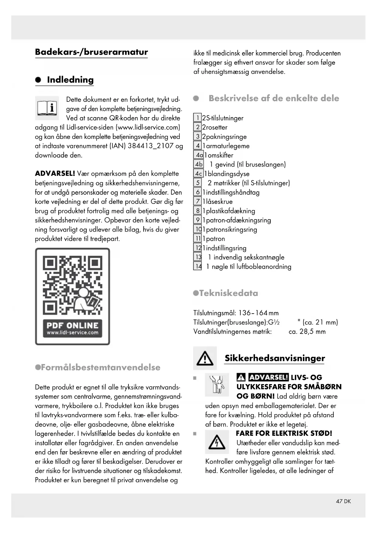 1 nøgle til luftbobleanordning Tekniske data Tilslutningsmål: 136–164 mm Tilslutninger (bruseslange): G½ (ca. 21 mm) Vandtilslutningernes møtrik: ca. 28,5 mm Sikkerhedsanvisninger LIVS- OG