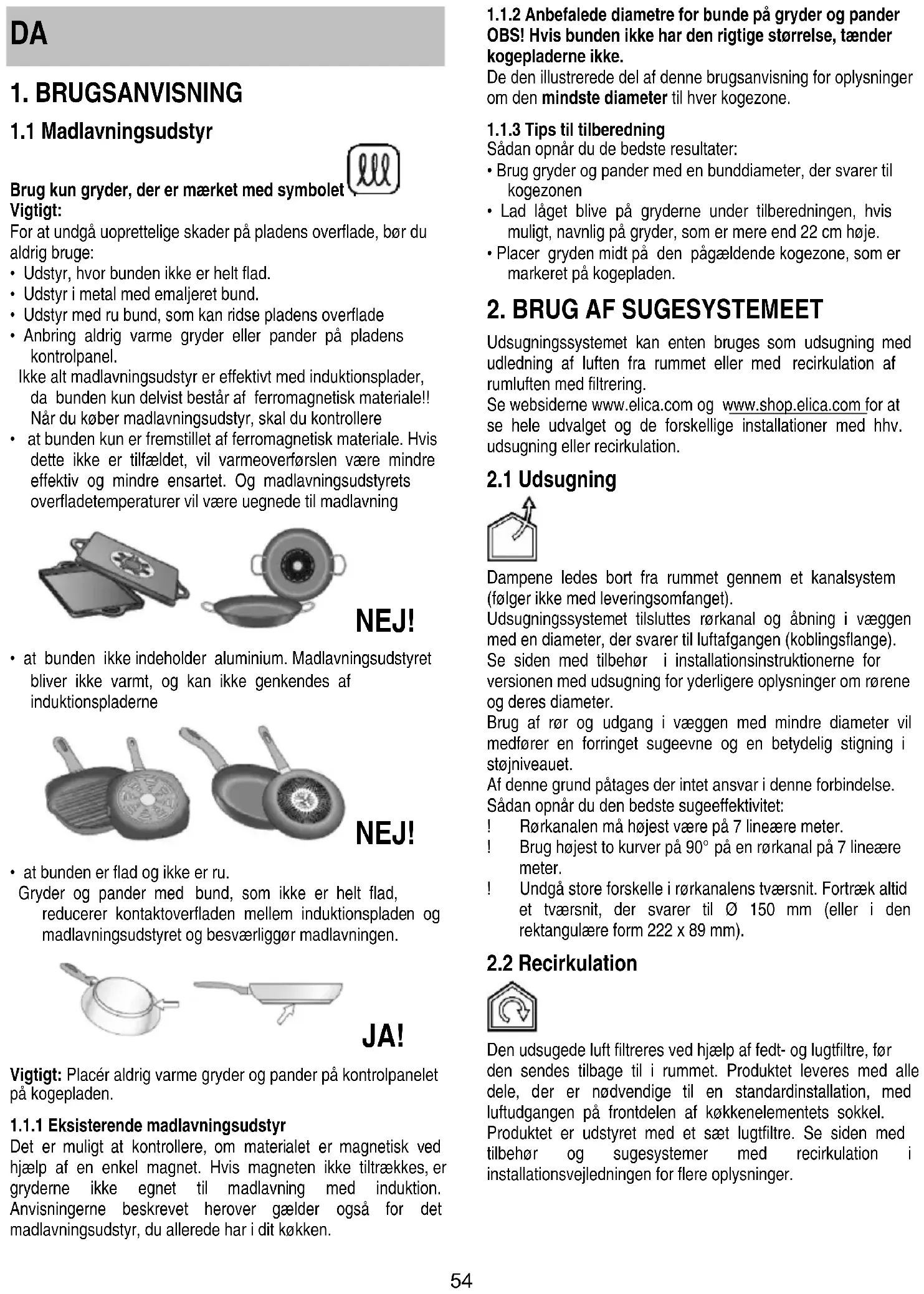 Udsugningssystemet kan enten bruges som udsugning med udledning af luften fra rummet eller med recirkulation af rumluften med filtrering. Se websiderne www.elica.com og www.shop.elica.com for at se hele udvalget og de forskellige installationer med hhv. udsugning eller recirkulation.