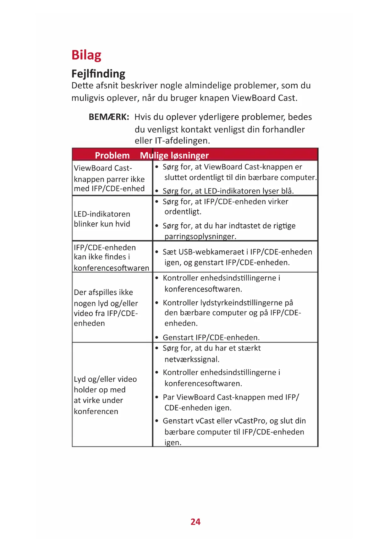 - OTA-service: Serverport: TCP 443 Serverens FQDN-navn: hps://vcastupdate.viewsonic.com24 Bilag Fejlnding Dee afsnit beskriver nogle almindelige problemer, som du muligvis oplever, når du bruger knapen ViewBoard Cast. BEMÆRK:ᅠ Hvis du oplever yderligere problemer, bedes du venligst kontakt venligst din forhandler eller IT-afdelingen. Problem Mulige løsninger ViewBoard Cast- knappen parrer ikke med IFP/CDE-enhed