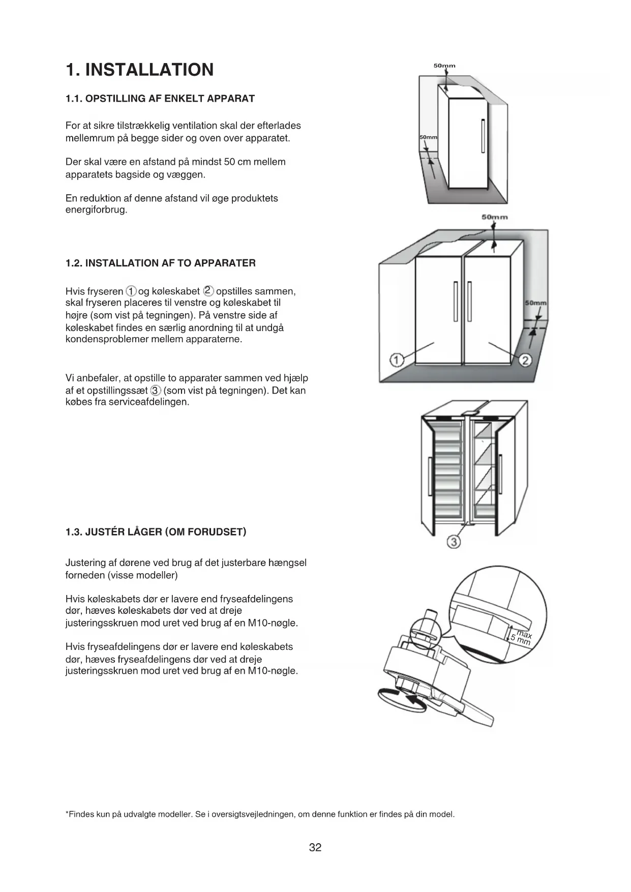 opstillessammen, skalfryserenplacerestilvenstreogkøleskabettil højre(somvistpåtegningen).Påvenstresideaf køleskabetfindesensærliganordningtilatundgå kondensproblemermellemapparaterne. Vianbefaler,atopstilletoapparatersammenvedhjælp afetopstillingssæt