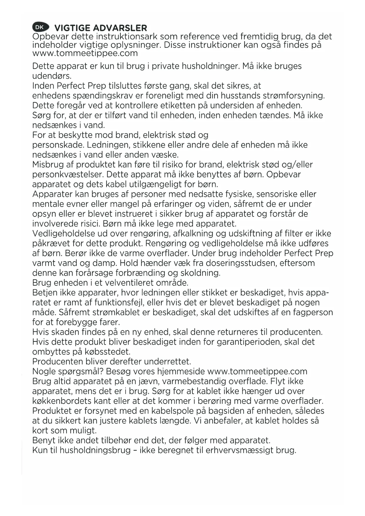 Dette apparat er kun til brug i private husholdninger. Må ikke bruges udendørs. Inden Perfect Prep tilsluttes første gang, skal det sikres, at enhedens spændingskrav er foreneligt med din husstands strømforsyning. Dette foregår ved at kontrollere etiketten på undersiden af enheden. Sørg for, at der er tilført vand til enheden, inden enheden tændes. Må ikke nedsænkes i vand. For at beskytte mod brand, elektrisk stød og personskade. Ledningen, stikkene eller andre dele af enheden må ikke nedsænkes i vand eller anden væske. Misbrug af produktet kan føre til risiko for brand, elektrisk stød og/eller personkvæstelser. Dette apparat må ikke benyttes af børn. Opbevar apparatet og dets kabel utilgængeligt for børn. Apparater kan bruges af personer med nedsatte fysiske, sensoriske eller mentale evner eller mangel på erfaringer og viden, såfremt de er under opsyn eller er blevet instrueret i sikker brug af apparatet og forstår de involverede risici. Børn må ikke lege med apparatet. Vedligeholdelse ud over rengøring, afkalkning og udskiftning af filter er ikke påkrævet for dette produkt. Rengøring og vedligeholdelse må ikke udføres af børn. Berør ikke de varme overflader. Under brug indeholder Perfect Prep varmt vand og damp. Hold hænder væk fra doseringsstudsen, eftersom denne kan forårsage forbrænding og skoldning. Brug enheden i et velventileret område. Betjen ikke apparater, hvor ledningen eller stikket er beskadiget, hvis appa- ratet er ramt af funktionsfejl, eller hvis det er blevet beskadiget på nogen måde. Såfremt strømkablet er beskadiget, skal det udskiftes af en fagperson for at forebygge farer. Hvis skaden findes på en ny enhed, skal denne returneres til producenten. Hvis dette produkt bliver beskadiget inden for garantiperioden, skal det ombyttes på købsstedet. Producenten bliver derefter underrettet. Nogle spørgsmål? Besøg vores hjemmeside www.tommeetippee.com Brug altid apparatet på en jævn, varmebestandig overflade. Flyt ikke apparatet, mens det er i brug. Sørg for at kablet ikke hænger ud over køkkenbordets kant eller at det kommer i berøring med varme overflader. Produktet er forsynet med en kabelspole på bagsiden af enheden, således at du sikkert kan justere kablets længde. Vi anbefaler, at kablet holdes så kort som muligt. Benyt ikke andet tilbehør end det, der følger med apparatet. Kun til husholdningsbrug – ikke beregnet til erhvervsmæssigt brug.BRUGSANVISNING OPSÆTNING: