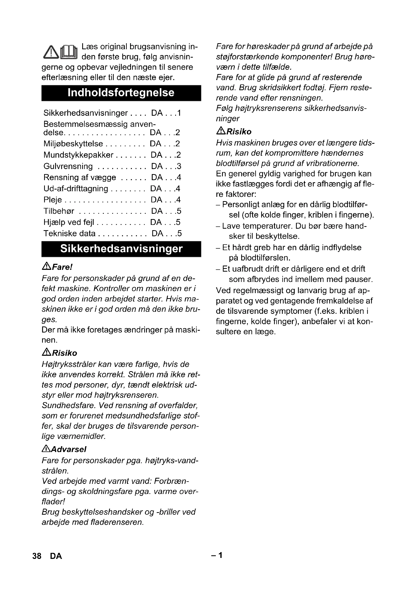 0,4 37PT– 1 Læs original brugsanvisning in- den første brug, følg anvisnin- gerne og opbevar vejledningen til senere efterlæsning eller til den næste ejer. Fare! Fare for personskader på grund af en de- fekt maskine. Kontroller om maskinen er i god orden inden arbejdet starter. Hvis ma- skinen ikke er i god orden må den ikke bru- ges. Der må ikke foretages ændringer på maski- nen. Risiko Højtryksstråler kan være farlige, hvis de ikke anvendes korrekt. Strålen må ikke ret- tes mod personer, dyr, tændt elektrisk ud- styr eller mod højtryksrenseren. Sundhedsfare. Ved rensning af overfalder, som er forurenet medsundhedsfarlige stof- fer, skal der bruges de tilsvarende person- lige værnemidler. 몇 Advarsel Fare for personskader pga. højtryks-vand- strålen. Ved arbejde med varmt vand: Forbræn- dings- og skoldningsfare pga. varme over- flader! Brug beskyttelseshandsker og -briller ved arbejde med fladerenseren. Fare for høreskader på grund af arbejde på støjforstærkende komponenter! Brug høre- værn i dette tilfælde. Fare for at glide på grund af resterende vand. Brug skridsikkert fodtøj. Fjern reste- rende vand efter rensningen. Følg højtryksrenserens sikkerhedsanvis- ninger Risiko Hvis maskinen bruges over et længere tids- rum, kan det kompromittere hændernes blodtilførsel på grund af vribrationerne. En generel gyldig varighed for brugen kan ikke fastlægges fordi det er afhængig af fle- re faktorer: – Personligt anlæg for en dårlig blodtilfør- sel (ofte kolde finger, kriblen i fingerne). – Lave temperaturer. Du bør bære hand- sker til beskyttelse. – Et hårdt greb har en dårlig indflydelse på blodtilførslen. – Et uafbrudt drift er dårligere end et drift som afbrydes ind imellem med pauser. Ved regelmæssigt og lanvarig brug af ap- paratet og ved gentagende fremkaldelse af de tilsvarende symptomer (f.eks. kriblen i fingerne, kolde finger), anbefaler vi at kon- sultere en læge. Indholdsfortegnelse Sikkerhedsanvisninger . . . . DA . . .1 Bestemmelsesmæssig anven- delse. . . . . . . . . . . . . . . . . . DA . . .2 Miljøbeskyttelse . . . . . . . . . DA . . .2 Mundstykkepakker . . . . . . . DA . . .2 Gulvrensning . . . . . . . . . . . DA . . .3 Rensning af vægge . . . . . . DA . . .4 Ud-af-drifttagning . . . . . . . . DA . . .4 Pleje . . . . . . . . . . . . . . . . . . DA . . .4 Tilbehør . . . . . . . . . . . . . . . DA . . .5 Hjælp ved fejl . . . . . . . . . . . DA . . .5 Tekniske data . . . . . . . . . . . DA . . .5 Sikkerhedsanvisninger 38 DA– 2 Ovefladerenseren er velegnet til rengøring af gulvflader og vægge i forbindelse med en højtryksrenser. Maksimalt vandtryk 25 MPa (250 bar). Maksimal vandtemperatur 85 °C. Snavsevandet bortledes via en slange. Emballagen kan genbruges. Smid ikke emballagen ud sammen med det almindelige husholdningsaffald, men afle- ver den til genbrug. Udtjente apparater indeholder værdi- fulde materialer, der kan og bør afle- veres til genbrug. Aflever derfor udtjente apparater på en genbrugsstation eller lignende. Henvisninger til indholdsstoffer (REACH) Aktuelle oplysninger til indholdsstoffer fin- der du på: www.kaercher.com/REACH OBS De nødvendige mundstykkepakker er af- stemt til den tilsvarende højtryksrenser og skal bestilles separat. 1 O-Ring 2 Rotationsarm 3 Mundstykke 4 Omløbermøtrik Læg O-Ringen ind i rotationsarmens not. Sæt mundstykket på. Skru mundstykket med omløbermøtrik let fast. OBS Udslipstrålen skal justeres parallelt til rota- tionsarmen. Symboler på maskinen 몇 Advarsel Fare for personskader på grund af rotationsarmen. Grib aldrig ind under maskinen hvis højtryksrenseren kører. En kort tid efter afbrydningen forsætter rotationsarmen med at dreje. Vendt til rotationsar- men standser inden der arbej- des på maskinen. Ved drift med varmt vand: 몇 Advarsel Forbrændingsfare! Berør ikke varme overflader! Fladerenseren må ikke sættes i drift uden at læse driftsvejled- ningen. Bestemmelsesmæssig an- vendelse Miljøbeskyttelse Mundstykkepakker Højtryksrenserens dyse- størrelse: Mundstykke- pakke 034...035 2.642-430.0 036...040 2.642-431.0 041...045 2.642-432.0 046...050 2.642-433.0 051...080 2.642-982.0 Montering af mundstykkepakken 39DA– 3 Indstil mundstykkets nøgleflade (nøgle- bredde 10) parallelt til rotationsarmen. Skru omløbermøtrikken (nøglebredde