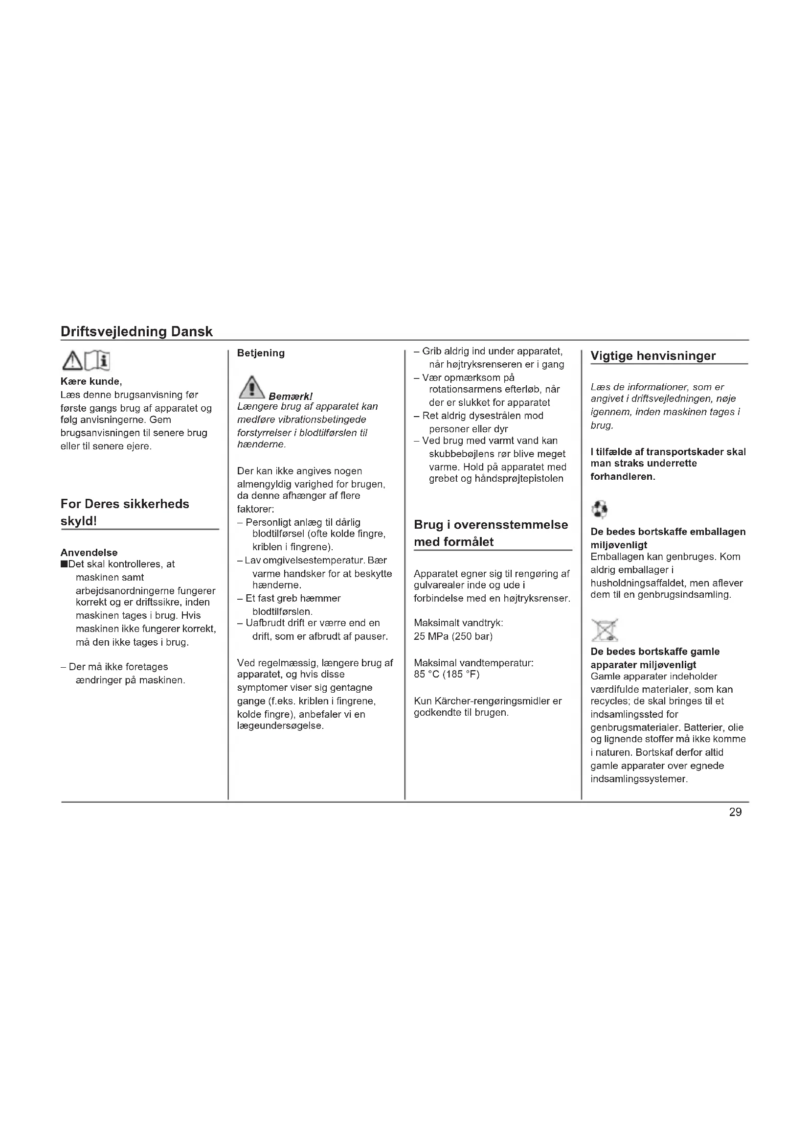 Kære kunde, Læs denne brugsanvisning før første gangs brug af apparatet og følg anvisningerne. Gem brugsanvisningen til senere brug eller til senere ejere. For Deres sikkerheds skyld! Anvendelse ■ Det skal kontrolleres, at maskinen samt arbejdsanordningerne fungerer korrekt og er driftssikre, inden maskinen tages i brug. Hvis maskinen ikke fungerer korrekt, må den ikke tages i brug. – Der må ikke foretages ændringer på maskinen. Betjening Bemærk! Længere brug af apparatet kan medføre vibrationsbetingede forstyrrelser i blodtilførslen til hænderne. Der kan ikke angives nogen almengyldig varighed for brugen, da denne afhænger af flere faktorer: – Personligt anlæg til dårlig blodtilførsel (ofte kolde fingre, kriblen i fingrene). – Lav omgivelsestemperatur. Bær varme handsker for at beskytte hænderne. – Et fast greb hæmmer blodtilførslen. – Uafbrudt drift er værre end en drift, som er afbrudt af pauser. Ved regelmæssig, længere brug af apparatet, og hvis disse symptomer viser sig gentagne gange (f.eks. kriblen i fingrene, kolde fingre), anbefaler vi en lægeundersøgelse. – Grib aldrig ind under apparatet, når højtryksrenseren er i gang – Vær opmærksom på rotationsarmens efterløb, når der er slukket for apparatet – Ret aldrig dysestrålen mod personer eller dyr – Ved brug med varmt vand kan skubbebøjlens rør blive meget varme. Hold på apparatet med grebet og håndsprøjtepistolen Brug i overensstemmelse med formålet Apparatet egner sig til rengøring af gulvarealer inde og ude i forbindelse med en højtryksrenser. Maksimalt vandtryk: 25 MPa (250 bar) Maksimal vandtemperatur: 85 °C (185 °F) Kun Kärcher-rengøringsmidler er godkendte til brugen. Vigtige henvisninger Læs de informationer, som er angivet i driftsvejledningen, nøje igennem, inden maskinen tages i brug. I tilfælde af transportskader skal man straks underrette forhandleren. De bedes bortskaffe emballagen miljøvenligt Emballagen kan genbruges. Kom aldrig emballager i husholdningsaffaldet, men aflever dem til en genbrugsindsamling. De bedes bortskaffe gamle apparater miljøvenligt Gamle apparater indeholder værdifulde materialer, som kan recycles; de skal bringes til et indsamlingssted for genbrugsmaterialer. Batterier, olie og lignende stoffer må ikke komme i naturen. Bortskaf derfor altid gamle apparater over egnede indsamlingssystemer.Driftsvejledning Dansk