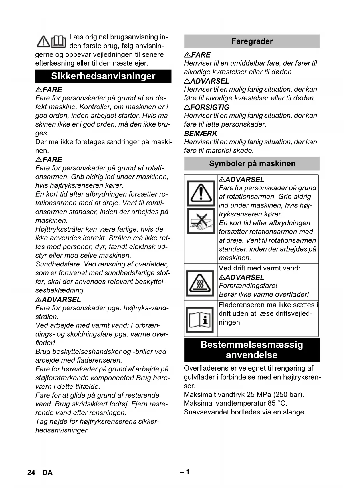 Lavar os rolos de guia com água limpa após a utilização e aplicar óleo após secar. Braço de rotação não rodopia: Controlar se os bicos de limpeza estão sujos. Potência de aspiração perde potência: Desgaste da coroa de cerdas - substi- tuir coroa de cerdas. Canal de aspiração ou mangueira de aspiração entupidos - limpar canal de aspiração e mangueira de aspiração. Bico injector entupido - limpar bico in- jector. Colocar fora de serviço Conservação Acessórios Acessórios: N.º de enco- menda Fixação de mangueira (co- po de aspiração para a fixa- ção em superfícies lisas) 2.642-528.0 Colector de impurezas (separador de sujidade grossa) 2.642-532.0 Suporte de mangueira (fi- xação de parede) 2.042-001.0 Coroa de escovas FRV 50 ME 6.371-011.0 Mangueira de extensão 4.441-040.0 Ajuda em caso de avarias 23PT– 1 Læs original brugsanvisning in- den første brug, følg anvisnin- gerne og opbevar vejledningen til senere efterlæsning eller til den næste ejer. FARE Fare for personskader på grund af en de- fekt maskine. Kontroller, om maskinen er i god orden, inden arbejdet starter. Hvis ma- skinen ikke er i god orden, må den ikke bru- ges. Der må ikke foretages ændringer på maski- nen. FARE Fare for personskader på grund af rotati- onsarmen. Grib aldrig ind under maskinen, hvis højtryksrenseren kører. En kort tid efter afbrydningen forsætter ro- tationsarmen med at dreje. Vent til rotati- onsarmen standser, inden der arbejdes på maskinen. Højttryksstråler kan være farlige, hvis de ikke anvendes korrekt. Strålen må ikke ret- tes mod personer, dyr, tændt elektrisk ud- styr eller mod selve maskinen. Sundhedsfare. Ved rensning af overfalder, som er forurenet med sundhedsfarlige stof- fer, skal der anvendes relevant beskyttel- sesbeklædning. 몇 ADVARSEL Fare for personskader pga. højtryks-vand- strålen. Ved arbejde med varmt vand: Forbræn- dings- og skoldningsfare pga. varme over- flader! Brug beskyttelseshandsker og -briller ved arbejde med fladerenseren. Fare for høreskader på grund af arbejde på støjforstærkende komponenter! Brug høre- værn i dette tilfælde. Fare for at glide på grund af resterende vand. Brug skridsikkert fodtøj. Fjern reste- rende vand efter rensningen. Tag højde for højtryksrenserens sikker- hedsanvisninger. FARE Henviser til en umiddelbar fare, der fører til alvorlige kvæstelser eller til døden 몇 ADVARSEL Henviser til en mulig farlig situation, der kan føre til alvorlige kvæstelser eller til døden. 몇 FORSIGTIG Henviser til en mulig farlig situation, der kan føre til lette personskader. BEMÆRK Henviser til en mulig farlig situation, der kan føre til materiel skade. Overfladerens er velegnet til rengøring af gulvflader i forbindelse med en højtryksren- ser. Maksimalt vandtryk 25 MPa (250 bar). Maksimal vandtemperatur 85 °C. Snavsevandet bortledes via en slange. Sikkerhedsanvisninger Faregrader Symboler på maskinen 몇 ADVARSEL Fare for personskader på grund af rotationsarmen. Grib aldrig ind under maskinen, hvis høj- tryksrenseren kører. En kort tid efter afbrydningen forsætter rotationsarmen med at dreje. Vent til rotationsarmen standser, inden der arbejdes på maskinen. Ved drift med varmt vand: 몇 ADVARSEL Forbrændingsfare! Berør ikke varme overflader! Fladerenseren må ikke sættes i drift uden at læse driftsvejled- ningen. Bestemmelsesmæssig anvendelse 24 DA– 2 Emballagen kan genbruges. Smid ikke emballagen ud sammen med det almindelige husholdningsaffald, men afle- ver den til genbrug. Udtjente apparater indeholder værdi- fulde materialer, der kan og bør afle- veres til genbrug. Aflever derfor ud- tjente apparater på en genbrugsstation el- ler lignende. Henvisninger til indholdsstoffer (REACH) Aktuelle oplysninger til indholdsstoffer fin- der du på: www.kaercher.com/REACH For at sørge for en fejlfri brug af højtryks- renseren, skal den passende højtryksdyse vælges. Bemærk: De nødvendige mundstykkepakker er af- stemt til den tilsvarende højtryksrenser og skal bestilles separat. Fig 1, se omslagsside 1 Mundstykkets størrelse (eksempel) Aflæs mundstykkets størrelse fra høj- trykrenserens typeskilt. Vælg mundstykkepakken i efterfølgen- de tabel, der passer til højtrykrenseren. Fig 2, se omslagsside 1O-Ring 2 Rotationsarm 3 Mundstykke 4 Omløbermøtrik Læg O-Ringen ind i rotationsarmens not. Sæt mundstykket på. Skru mundstykket med omløbermøtrik let fast. Bemærk: Udslipstrålen skal justeres parallelt til rota- tionsarmen. Fig 3, se omslagsside Indstil mundstykkets nøgleflade (nøgle- bredde 10) parallelt til rotationsarmen. Skru omløbermøtrikken (nøglebredde