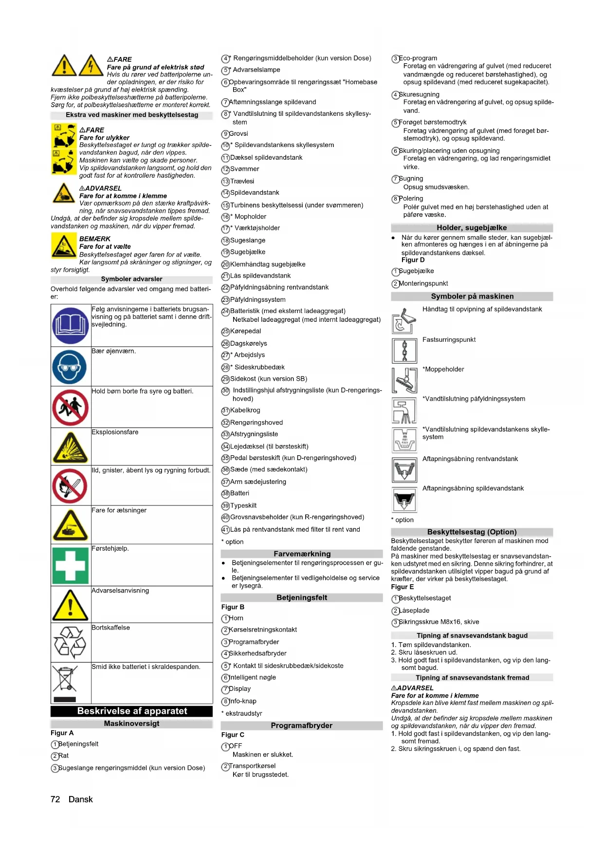 • EU-overensstemmelseserklæring Dansk FARE Fare på grund af elektrisk stød Hvis du rører ved batteripolerne un- der opladningen, er der risiko for kvæstelser på grund af høj elektrisk spænding. Fjern ikke polbeskyttelseshætterne på batteripolerne. Sørg for, at polbeskyttelseshætterne er monteret korrekt. Ekstra ved maskiner med beskyttelsestag FARE Fare for ulykker Beskyttelsestaget er tungt og trækker spilde- vandstanken bagud, når den vippes. Maskinen kan vælte og skade personer. Vip spildevandstanken langsomt, og hold den godt fast for at kontrollere hastigheden. 몇ADVARSEL Fare for at komme i klemme Vær opmærksom på den stærke kraftpåvirk- ning, når snavsevandstanken tippes fremad. Undgå, at der befinder sig kropsdele mellem spilde- vandstanken og maskinen, når du vipper fremad. BEMÆRK Fare for at vælte Beskyttelsestaget øger faren for at vælte. Kør langsomt på skråninger og stigninger, og styr forsigtigt. Symboler advarsler Overhold følgende advarsler ved omgang med batteri- er: Beskrivelse af apparatet Maskinoversigt Figur A 1 Betjeningsfelt 2 Rat 3 Sugeslange rengøringsmiddel (kun version Dose) 4 * Rengøringsmiddelbeholder (kun version Dose) 5 * Advarselslampe 6 Opbevaringsområde til rengøringssæt "Homebase Box" 7 Aftømningsslange spildevand 8 * Vandtilslutning til spildevandstankens skyllesy- stem 9 Grovsi 10 * Spildevandstankens skyllesystem 11 Dæksel spildevandstank 12 Svømmer 13 Trævlesi 14 Spildevandstank 15 Turbinens beskyttelsessi (under svømmeren) 16 * Mopholder 17 * Værktøjsholder 18 Sugeslange 19 Sugebjælke 20 Klemhåndtag sugebjælke 21 Lås spildevandstank 22 Påfyldningsåbning rentvandstank 23 Påfyldningssystem 24 Batteristik (med eksternt ladeaggregat) Netkabel ladeaggregat (med internt ladeaggregat) 25 Kørepedal 26 Dagskørelys 27 * Arbejdslys 28 * Sideskrubbedæk 29 Sidekost (kun version SB) 30 Indstillingshjul afstrygningsliste (kun D-rengørings- hoved) 31 Kabelkrog 32 Rengøringshoved 33 Afstrygningsliste 34 Lejedæksel (til børsteskift) 35 Pedal børsteskift (kun D-rengøringshoved) 36 Sæde (med sædekontakt) 37 Arm sædejustering 38 Batteri 39 Typeskilt 40 Grovsnavsbeholder (kun R-rengøringshoved) 41 Lås på rentvandstank med filter til rent vand p. 7972