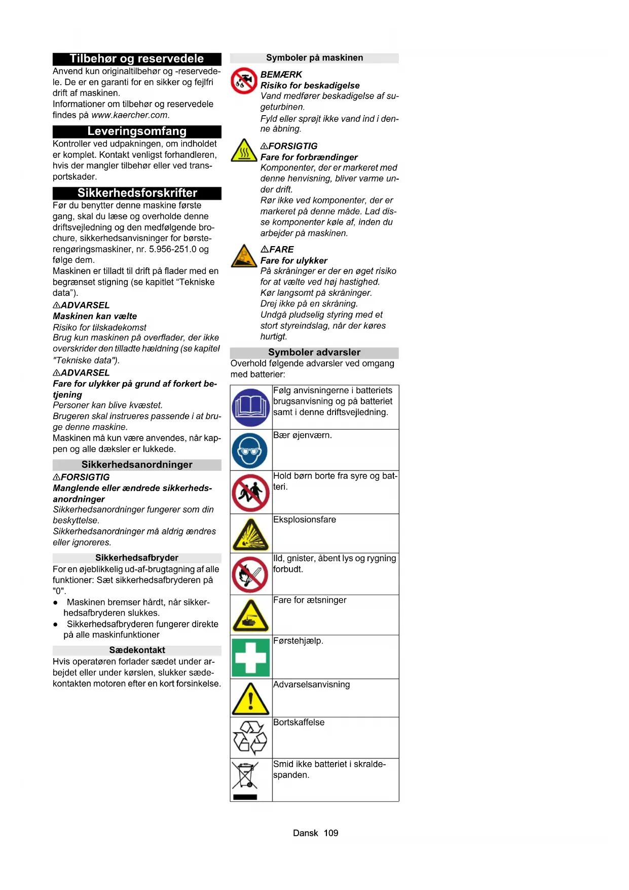 - EU-overensstemmelseserklæring Dansk 109 Tilbehør og reservedele Anvend kun originaltilbehør og -reservede- le. De er en garanti for en sikker og fejlfri drift af maskinen. Informationer om tilbehør og reservedele findes på www.kaercher.com. Leveringsomfang Kontroller ved udpakningen, om indholdet er komplet. Kontakt venligst forhandleren, hvis der mangler tilbehør eller ved trans- portskader. Sikkerhedsforskrifter Før du benytter denne maskine første gang, skal du læse og overholde denne driftsvejledning og den medfølgende bro- chure, sikkerhedsanvisninger for børste- rengøringsmaskiner, nr. 5.956-251.0 og følge dem. Maskinen er tilladt til drift på flader med en begrænset stigning (se kapitlet “Tekniske data”). 몇 ADVARSEL Maskinen kan vælte Risiko for tilskadekomst Brug kun maskinen på overflader, der ikke overskrider den tilladte hældning (se kapitel "Tekniske data"). 몇 ADVARSEL Fare for ulykker på grund af forkert be- tjening Personer kan blive kvæstet. Brugeren skal instrueres passende i at bru- ge denne maskine. Maskinen må kun være anvendes, når kap- pen og alle dæksler er lukkede. Sikkerhedsanordninger 몇 FORSIGTIG Manglende eller ændrede sikkerheds- anordninger Sikkerhedsanordninger fungerer som din beskyttelse. Sikkerhedsanordninger må aldrig ændres eller ignoreres. Sikkerhedsafbryder For en øjeblikkelig ud-af-brugtagning af alle funktioner: Sæt sikkerhedsafbryderen på "0". ● Maskinen bremser hårdt, når sikker- hedsafbryderen slukkes. ● Sikkerhedsafbryderen fungerer direkte på alle maskinfunktioner Sædekontakt Hvis operatøren forlader sædet under ar- bejdet eller under kørslen, slukker sæde- kontakten motoren efter en kort forsinkelse. Symboler på maskinen BEMÆRK Risiko for beskadigelse Vand medfører beskadigelse af su- geturbinen. Fyld eller sprøjt ikke vand ind i den- ne åbning. 몇FORSIGTIG Fare for forbrændinger Komponenter, der er markeret med denne henvisning, bliver varme un- der drift. Rør ikke ved komponenter, der er markeret på denne måde. Lad dis- se komponenter køle af, inden du arbejder på maskinen. FARE Fare for ulykker På skråninger er der en øget risiko for at vælte ved høj hastighed. Kør langsomt på skråninger. Drej ikke på en skråning. Undgå pludselig styring med et stort styreindslag, når der køres hurtigt. Symboler advarsler Overhold følgende advarsler ved omgang med batterier: Følg anvisningerne i batteriets brugsanvisning og på batteriet samt i denne driftsvejledning. Bær øjenværn. Hold børn borte fra syre og bat- teri. Eksplosionsfare Ild, gnister, åbent lys og rygning forbudt. Fare for ætsninger Førstehjælp. Advarselsanvisning Bortskaffelse Smid ikke batteriet i skralde- spanden.110 Dansk Maskinbeskrivelse MaskinoversigtDansk 111 1 * Påfyldningssystem 2 Lås på rentvandstank med filter til rent vand 3 Grovsi 4 Dæksel spildevandstank 5 Betjeningsfelt 6 Indstillingshjul afstrygningsliste (kun D- rengøringshoved) 7 Pedal børsteskift (kun D-rengøringsho- ved) 8 Rat 9 Afstrygningsliste 10 Greb børsteskift (kun R-rengøringsho- ved) 11 Sidelys 12 Grovsnavsbeholder (kun R-rengørings- hoved) 13 Rengøringsmiddeldunk 14 Typeskilt 15 Sugeslange rengøringsmiddel 16 Batteri 17 * Internt ladeaggregat 18 Batteristik (med eksternt ladeaggregat) Netkabel ladeaggregat (med internt la- deaggregat) 19 Opbevaringsområde til rengøringssæt "Homebase Box" 20 * Advarselslampe 21 Sæde 22 Oplåsning spildevandstank 23 Arm sædejustering 24 Påfyldningsåbning rentvandstank 25 Slangeholder 26 Dagskørelys 27 Kørepedal 28 * Sideskrubbedæk 29 * Vandtilslutning til spildevandstankens skyllesystem 30 Støtte dæksel spildevandstank 31 Svømmer 32 Trævlesi 33 Opbevaring til sugebjælke 34 Aftapningsslange til spildevand med do- seringsanordning 35 Spildevandstank 36 * Mopholder 37 Sugeslange 38 Klemhåndtag sugebjælke 39 Lås spildevandstank 40 Sugebjælke 41 Rengøringshoved 42 Niveauvisning rent vand 43 Rentvandstank p. 122
