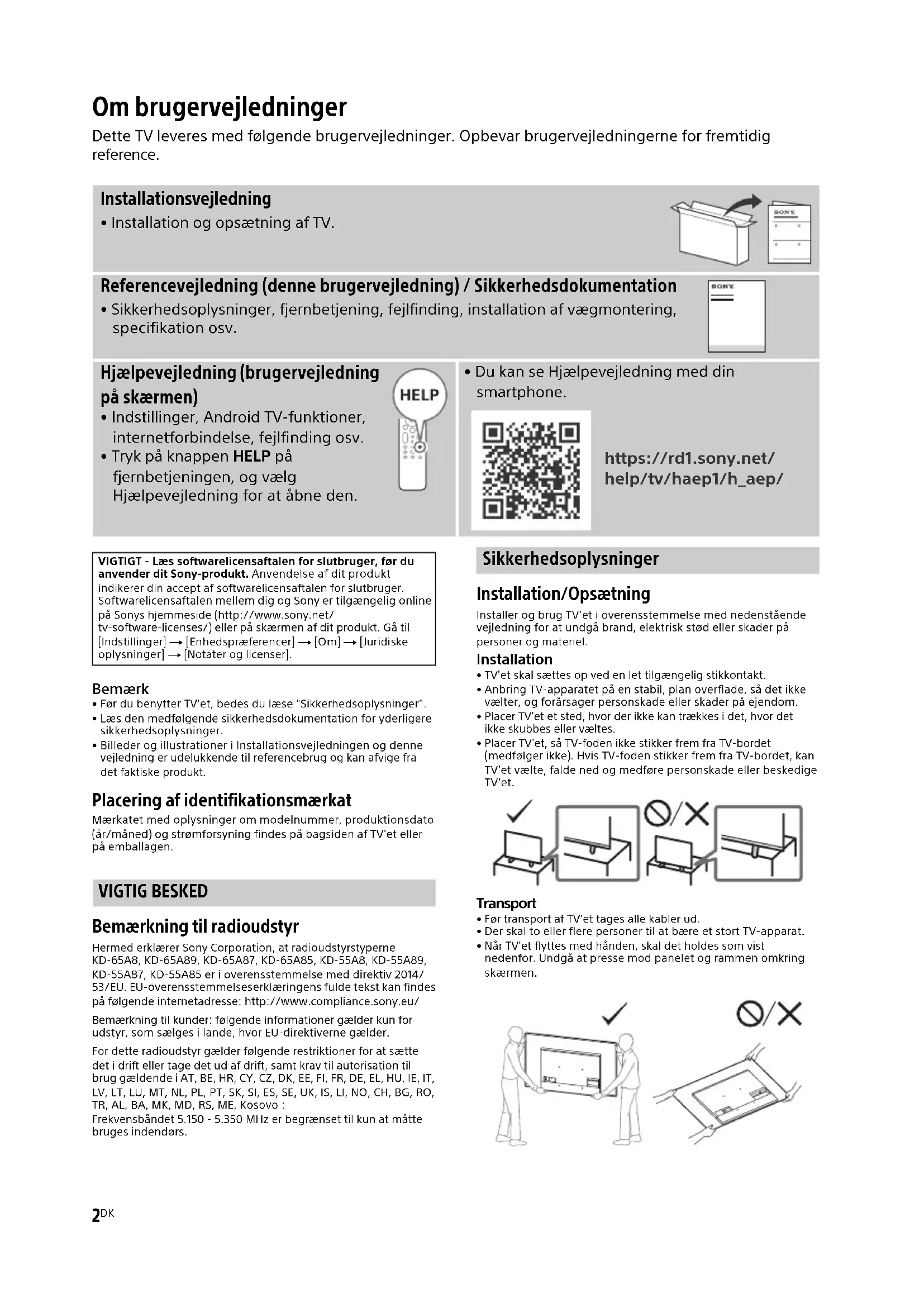 Hermed erklaer Sony Corporation, at radioudstyperne KD-65A8, KD-65A89, KD-65A87, KD-65A85, KD-55A8, KD-55A89, KD-55A87, KD-55A85 er i overensstammelse med direktiv 2014/ 53/EU. EU-overensstammelseserklaeringens fulde tekst kan findes pa fologende internetadresse: http://www.compliance.sony.eu/ Bemaerkning til kunder: folgende informationer gelder kun for udstyr, som saelges i lande, hvor EU-direktiverne gelder.