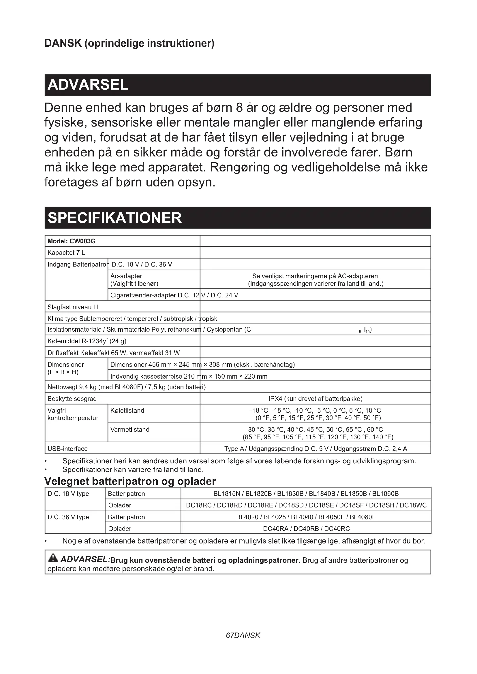 - Carregador e bateria originais Makita NOTA: Eles podem diferir de país para país. Eles podem diferir de país para país.67 DANSK DANSK (oprindelige instruktioner) ADVARSEL Denne enhed kan bruges af børn 8 år og ældre og personer med fysiske, sensoriske eller mentale mangler eller manglende erfaring og viden, forudsat at de har fået tilsyn eller vejledning i at bruge enheden på en sikker måde og forstår de involverede farer. Børn må ikke lege med apparatet. Rengøring og vedligeholdelse må ikke foretages af børn uden opsyn. SPECIFIKATIONER Model: CW003GKapacitet 7 LIndgang Batteripatron D.C. 18 V / D.C. 36 VAc-adapter (Valgfrit tilbehør)Se venligst markeringerne på AC-adapteren. (Indgangsspændingen varierer fra land til land.)Cigarettænder-adapter D.C. 12 V / D.C. 24 VSlagfast niveau IIIKlima type Subtempereret / tempereret / subtropisk / tropiskIsolationsmateriale / Skummateriale Polyurethanskum / Cyclopentan (C