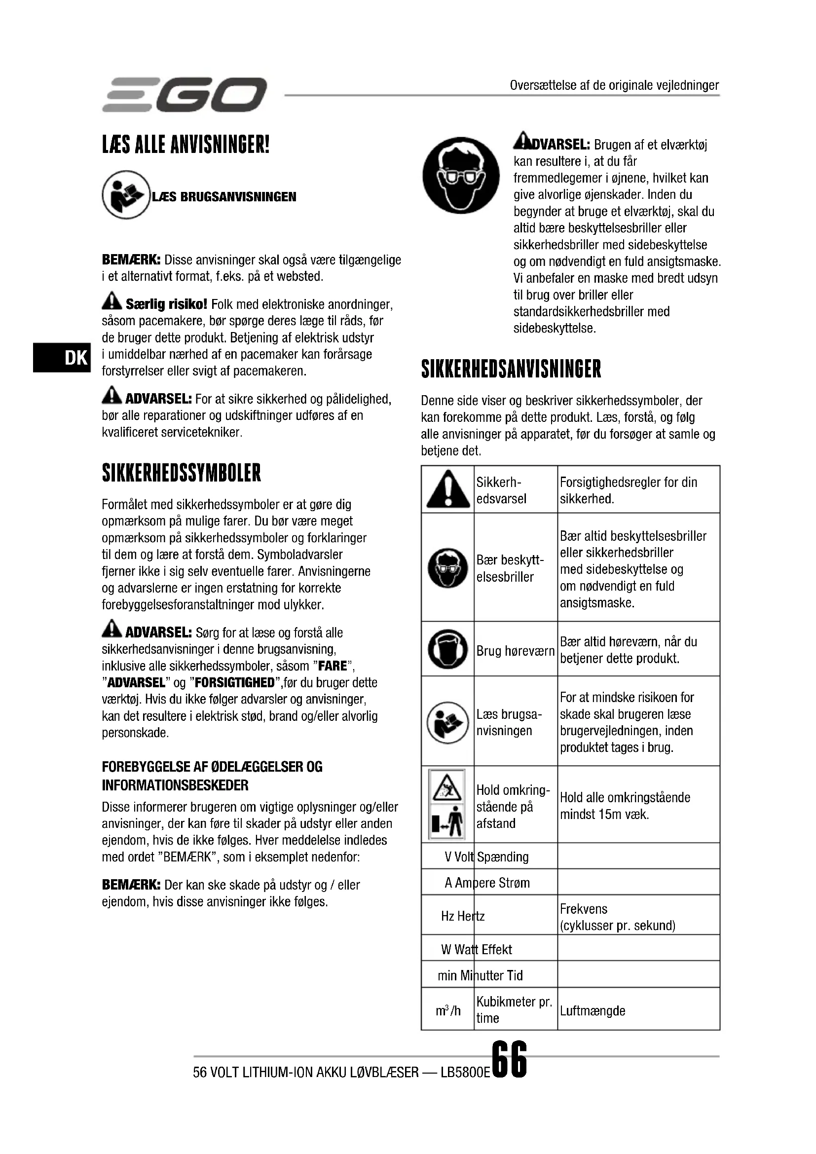 INFORMATIONSBESKEDER Disse informerer brugeren om vigtige oplysninger og/eller anvisninger, der kan føre til skader på udstyr eller anden ejendom, hvis de ikke følges. Hver meddelelse indledes med ordet ”BEMÆRK”, som i eksemplet nedenfor: BEMÆRK: Der kan ske skade på udstyr og / eller ejendom, hvis disse anvisninger ikke følges. Oversættelse af de originale vejledninger56 VOLT LITHIUM-ION AKKU LØVBLÆSER — LB5800E