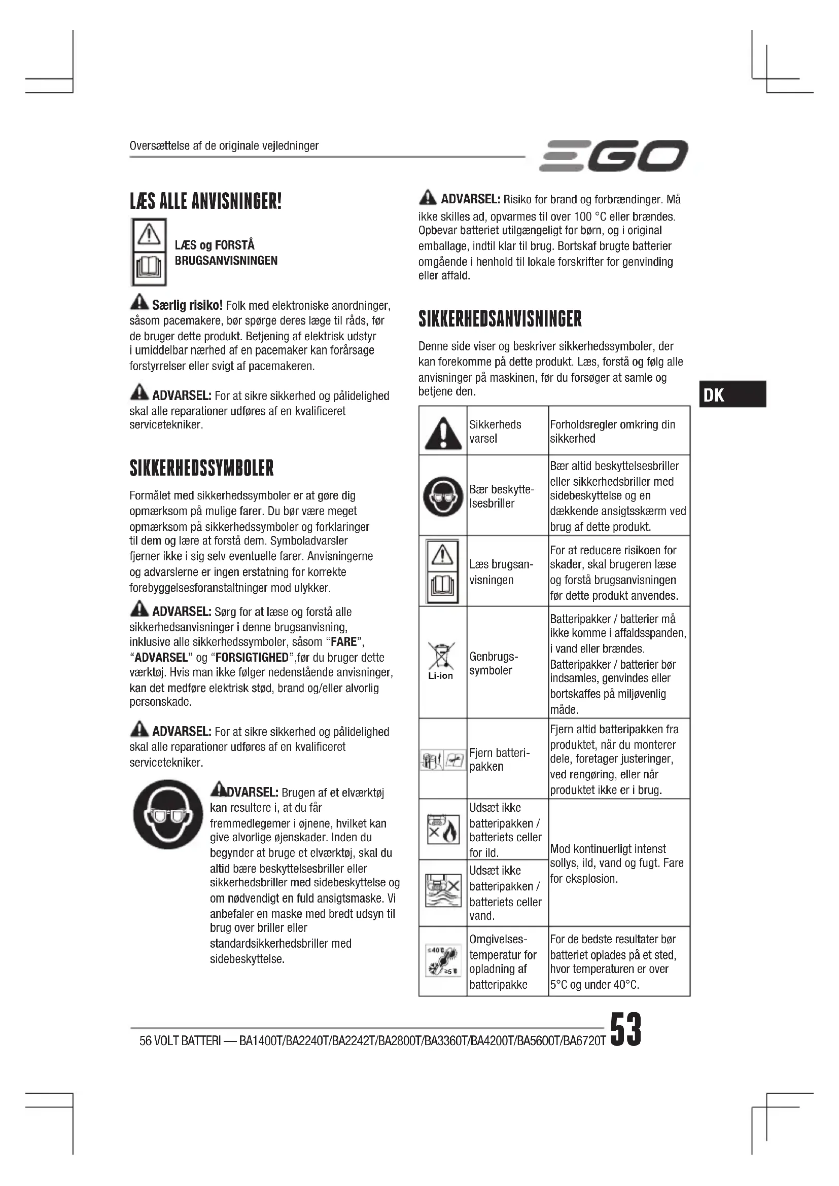 č Ydersiderne kan rengøres med en klud eller en blød ikke-metallisk børste.FJERNELSE AF BATTERIPAKKE OG FORBEREDELSE TIL GENVINDING Li-ion Smid ikke batterioplader og batterier / genopladelige batterier i affaldsspanden!Ifølge EU-direktiv 2012/19/EU og EU-direktiv 2006/66/EF skal henholdsvis elektrisk og elektronisk udstyr, der ikke længere er brugbart, og defekte eller brugte batterier / batteripakker indsamles særskilt og bortskaffes på miljørigtig måde. Kontakt din lokale affaldsmyndighed for oplysninger om tilgængelige muligheder genvinding og/eller bortskaffelsesmuligheder. ADVARSEL: Efter fjernelse af batteripakken til bortskaffelse eller genvinding, dækkes batteripakkens poler med kraftig tape. Forsøg ikke at ødelægge eller adskille batteripakken eller fjerne nogen af dens komponenter. Lithium-ion-batterier skal genvindes eller bortskaffes korrekt. Rør heller aldrig polerne med metalgenstande og/eller kropsdele, da det kan give kortslutning. Holdes utilgængeligt for børn. Manglende overholdelse af disse advarsler kan resultere i brand og/eller alvorlig personskade. FEJLFINDING PROBLEM ÅRSAG LØSNINGBatteripakkens opladning er reduceret efter mere end en måneds stilstand.Batteripakken har automatisk udført selvvedligeholdelse for at forlænge sin levetid.Oplad batteripakken fuldt før brug.De 5 LED-lys lyser rødt, når batteripakken er i brug.Batteriet er for varmt.Afkøl batteripakken, indtil temperaturen falder til under 67 °C.Batteriets (BA1400T/BA2242T/BA2800T/BA3360T/BA4200T/BA5600T/BA6720T) endedæksel bliver varmt under opbevaring. En af de 5 lysindikatorer lyser rødt i 10 sekunder, hvorefter den slukker i 10 sekunder og derefter lyser rødt i 10 sekunder. Eller de 5 lysdioder blinker grønt hvert andet sekund. Dette afhænger af batteritypen.Batteripakken udfører automatisk selvvedligeholdelse for at forlænge batterilevetiden.Der kræves ingen handling: Dette er normalt. Tryk på strømindikatoren vil standse selvvedligeholdelsesprocessen.Batteriet oplades ikke ordentligt med opladeren (opladeren virker ikke eller kold/varm-batteriindikatoren blinker).Batteripakken er for varm/kold under opladningenSæt batteripakken i igen (kun på BA2240T) Nedkøl eller varm batteripakken. Opladning begynder, når batteripakken vender tilbage til normal temperatur GARANTI EGO’s GARANTIPOLITIK Besøg venligst hjemmesiden egopowerplus.eu for fuldstændige vilkår og betingelser for EGO’s garantipolitik.56 VOLT ACKUMULATOR — BA1400T/BA2240T/BA2242T/BA2800T/BA3360T/BA4200T/BA5600T/BA6720T