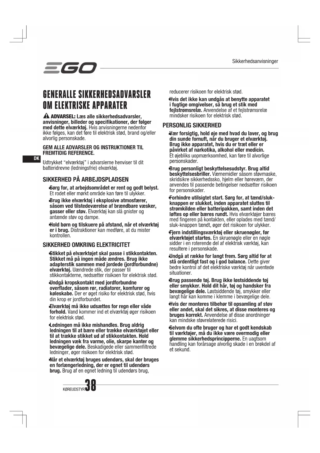 Ved situationer, der ikke er dækket i denne vejledning: Vær forsigtig, og arbejd med omtanke. Kontakt EGO’s kundeservice for hjælp.