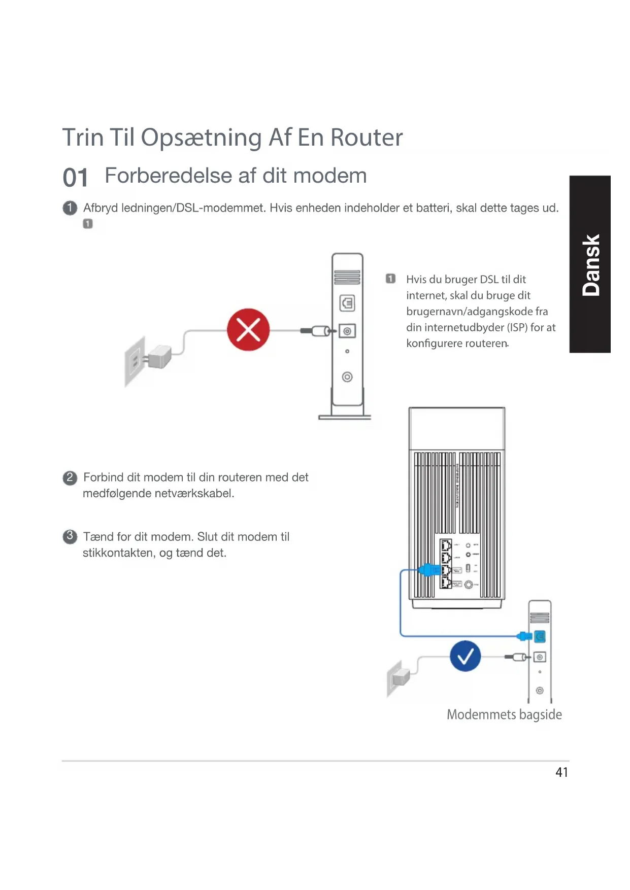 Afbryd ledningen/DSL-modemmet. Hvis enheden indeholder et batteri, skal dette tages ud. Modemmets bagside Hvis du bruger DSL til dit internet, skal du bruge dit brugernavn/adgangskode fra din internetudbyder (ISP) for at kongurere routeren