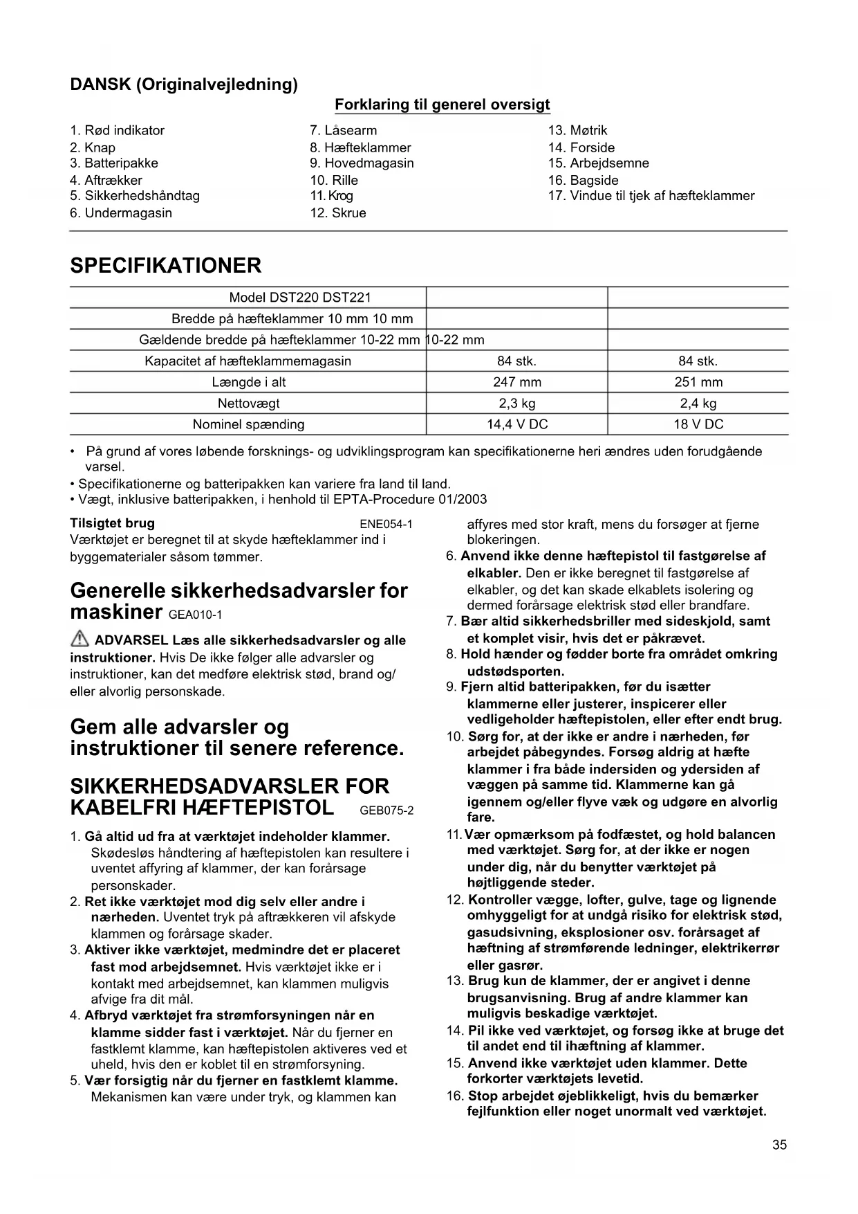 - Vægt, inklusive batteripakken, i henhold til EPTA-Procedure 01/2003 Tilsigtet brug ENE054-1 Værktøjet er beregnet til at skyde hæfteklammer ind i byggematerialer såsom tømmer. Generelle sikkerhedsadvarsler for maskiner GEA010-1 ADVARSEL Læs alle sikkerhedsadvarsler og alle instruktioner. Hvis De ikke følger alle advarsler og instruktioner, kan det medføre elektrisk stød, brand og/ eller alvorlig personskade. Gem alle advarsler og instruktioner til senere reference. SIKKERHEDSADVARSLER FOR