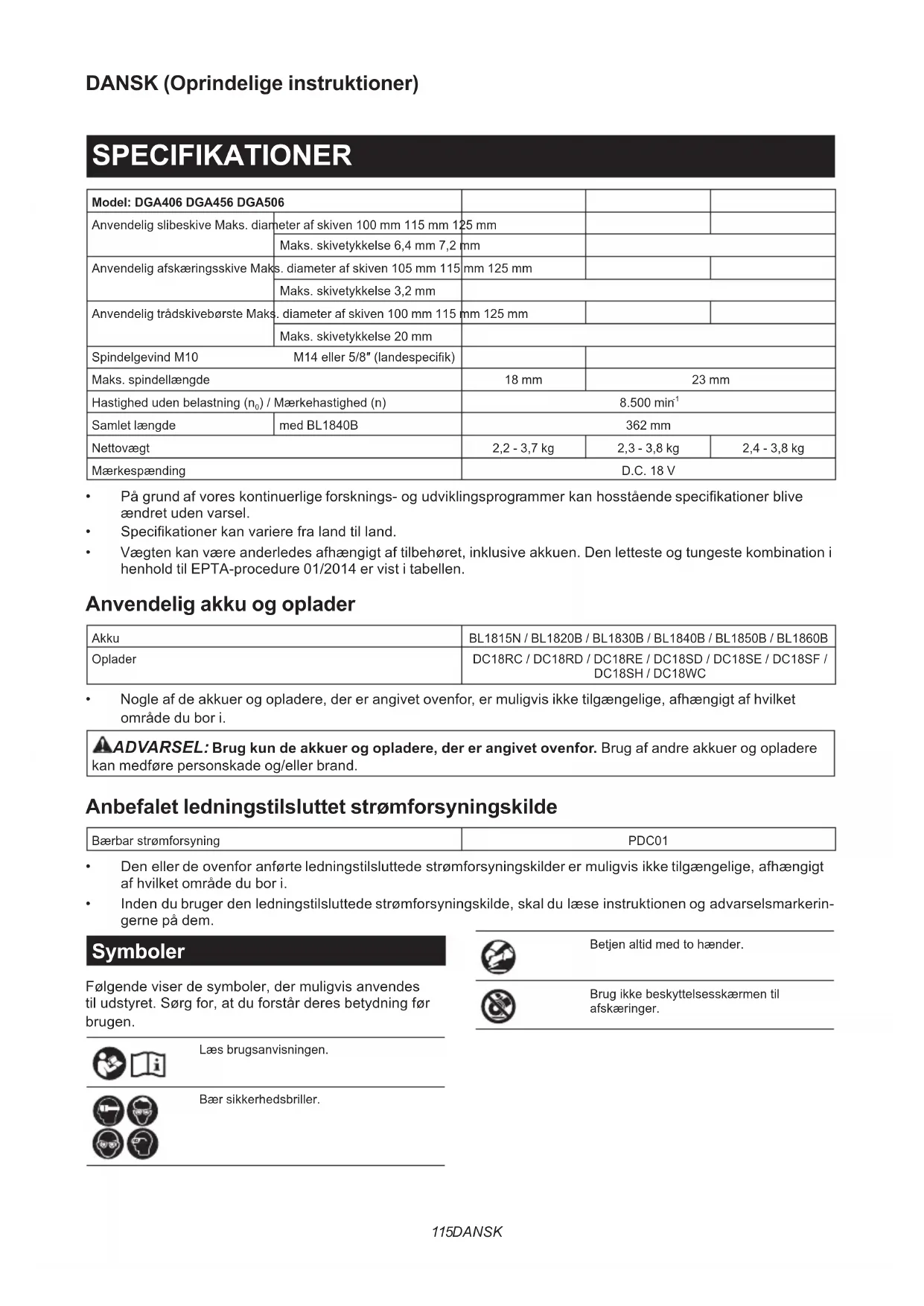 DGA406 2,5 m/s eller mindre 1,5DGA456 2,5 m/s eller mindre 1,5DGA506 2,5 m/s eller mindre 1,5 BEMÆRK: De(n) angivne totalværdi(er) for vibration er målt i overensstemmelse med en standardtestmetode og kan anvendes til at sammenligne en maskine med en anden. BEMÆRK: De(n) angivne totalværdi(er) for vibration kan også anvendes i en præliminær eksponeringsvurdering. ADVARSEL: Vibrationsemissionen under den faktiske anvendelse af maskinen kan være forskellig fra de(n) angivne værdi(er), afhængigt af den måde hvorpå maskinen anvendes, især den type arbejdsemne der behandles. ADVARSEL: Sørg for at identicere de sikkerhedsforskrifter til beskyttelse af operatøren, som er baseret på en vurdering af eksponering under de faktiske brugsforhold (med hensyntagen til alle dele i brugscyklussen, f.eks. de gange, hvor maskinen er slukket, og når den kører i tomgang i tilgift til afbrydertiden). ADVARSEL: Den erklærede værdi for vibrationsemission gælder for el-værktøjets primære anvendelser. Hvis el-værktøjet imidlertid anvendes til andre formål, kan værdien for vibrationsemission være anderledes. EF-overensstemmelseserklæring Kun for lande i Europa EF-overensstemmelseserklæringen er inkluderet som Bilag A i denne brugsanvisning. SIKKERHEDSAD- VARSLER Almindelige sikkerhedsregler for el-værktøj ADVARSEL Læs alle sikkerhedsadvarsler, instruktioner, illustrationer og specikationer, der følger med denne maskine. Hvis du ikke følger alle nedenstående instruktioner, kan det medføre elektrisk stød, brand og/eller alvorlig personskade. Gem alle advarsler og instruktio- ner til fremtidig reference. Ordet "el-værktøj" i advarslerne henviser til det netfor- synede (netledning) el-værktøj eller batteriforsynede (akku) el-værktøj. Sikkerhedsadvarsler for ledningsfri sliber Almindelige sikkerhedsadvarsler for anvendelser med slibning, sandslibning, trådbørstning eller afskæring: