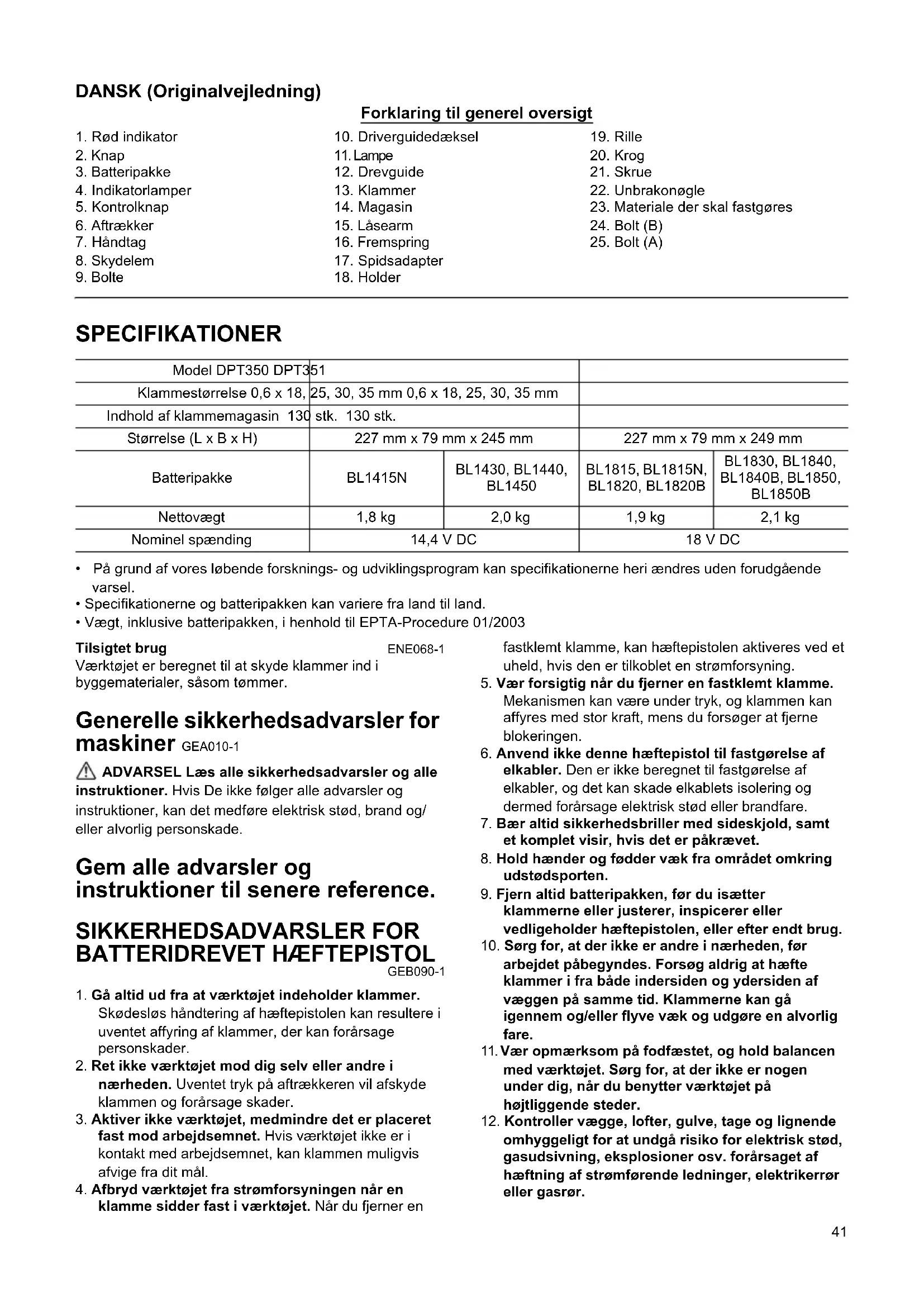 - Vægt, inklusive batteripakken, i henhold til EPTA-Procedure 01/2003 Tilsigtet brug ENE068-1 Værktøjet er beregnet til at skyde klammer ind i byggematerialer, såsom tømmer. Generelle sikkerhedsadvarsler for maskiner GEA010-1 ADVARSEL Læs alle sikkerhedsadvarsler og alle instruktioner. Hvis De ikke følger alle advarsler og instruktioner, kan det medføre elektrisk stød, brand og/ eller alvorlig personskade. Gem alle advarsler og instruktioner til senere reference. SIKKERHEDSADVARSLER FOR