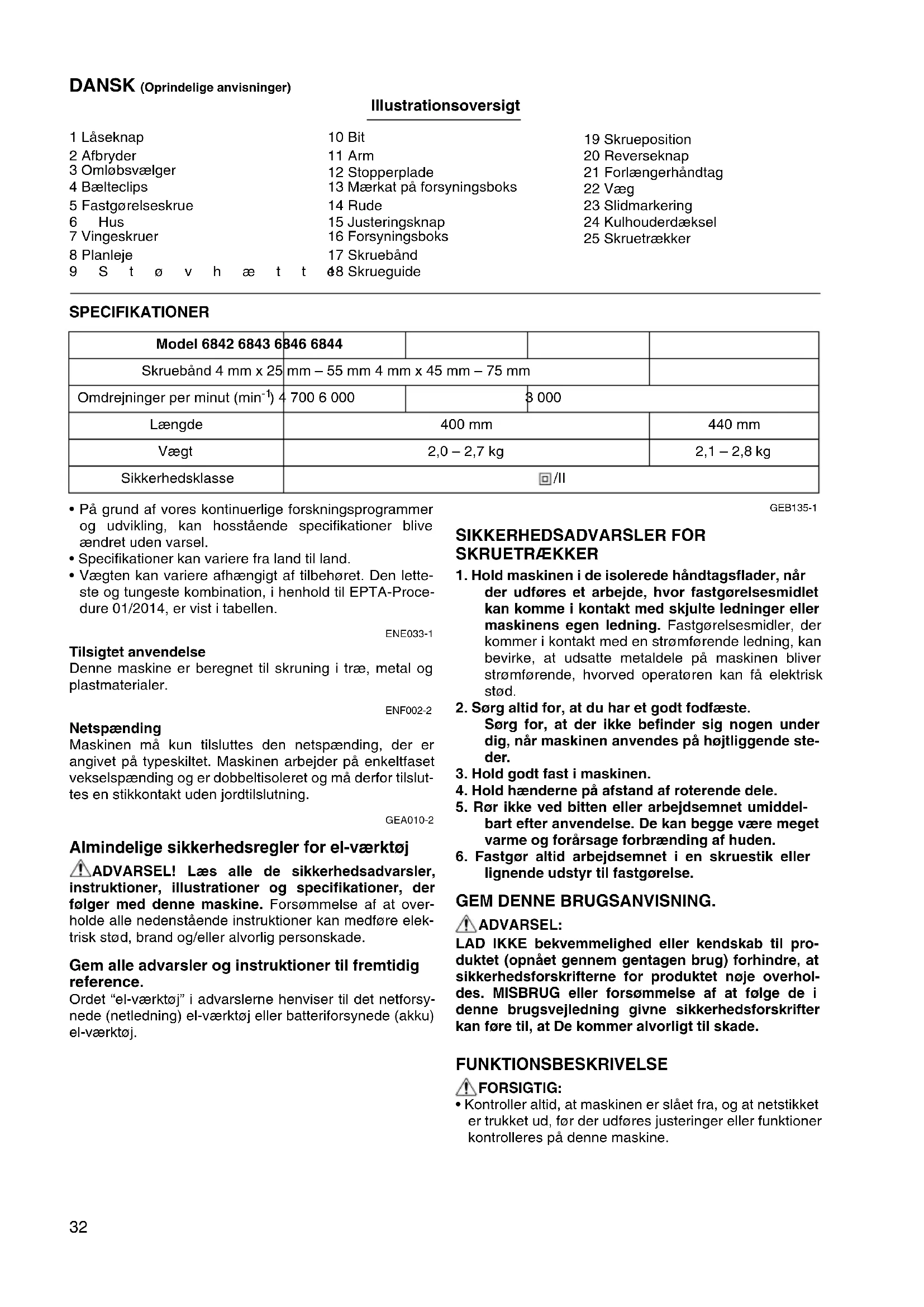 - Vægten kan variere afhængigt af tilbehøret. Den lette- ste og tungeste kombination, i henhold til EPTA-Proce- dure 01/2014, er vist i tabellen. ENE033-1 Tilsigtet anvendelse Denne maskine er beregnet til skruning i træ, metal og plastmaterialer. ENF002-2 Netspænding Maskinen må kun tilsluttes den netspænding, der er angivet på typeskiltet. Maskinen arbejder på enkeltfaset vekselspænding og er dobbeltisoleret og må derfor tilslut- tes en stikkontakt uden jordtilslutning. GEA010-2 Almindelige sikkerhedsregler for el-værktøj ADVARSEL! Læs alle de sikkerhedsadvarsler, instruktioner, illustrationer og specifikationer, der følger med denne maskine. Forsømmelse af at over- holde alle nedenstående instruktioner kan medføre elek- trisk stød, brand og/eller alvorlig personskade. Gem alle advarsler og instruktioner til fremtidig reference. Ordet “el-værktøj” i advarslerne henviser til det netforsy- nede (netledning) el-værktøj eller batteriforsynede (akku) el-værktøj. GEB135-1 SIKKERHEDSADVARSLER FOR SKRUETRÆKKER