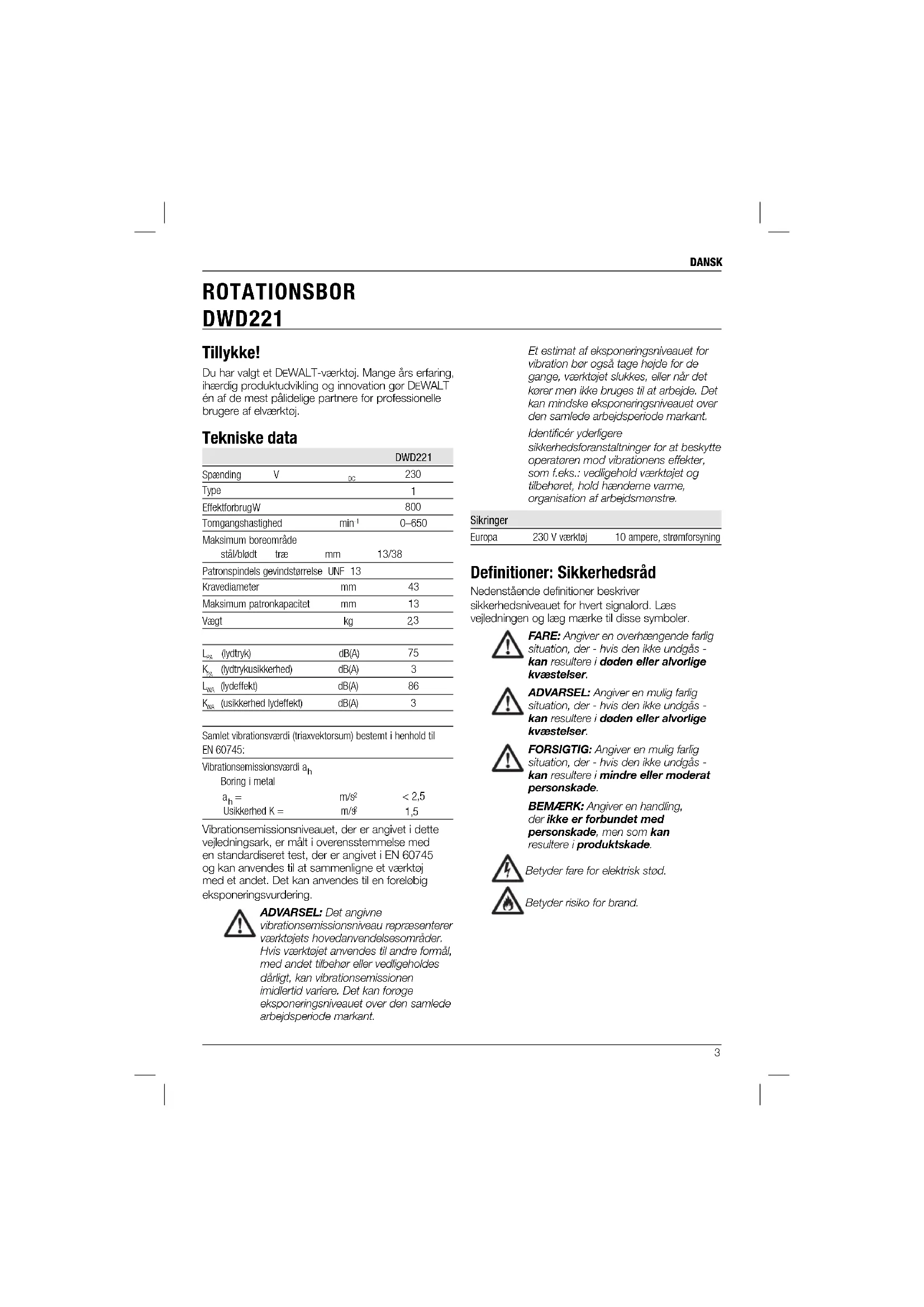 ROTATIONSBOR DWD221 Tillykke! Du har valgt et DEWALT-værktøj. Mange års erfaring, ihærdig produktudvikling og innovation gør DEWALT én af de mest pålidelige partnere for professionelle brugere af elværktøj. Tekniske data DWD221 Spænding V