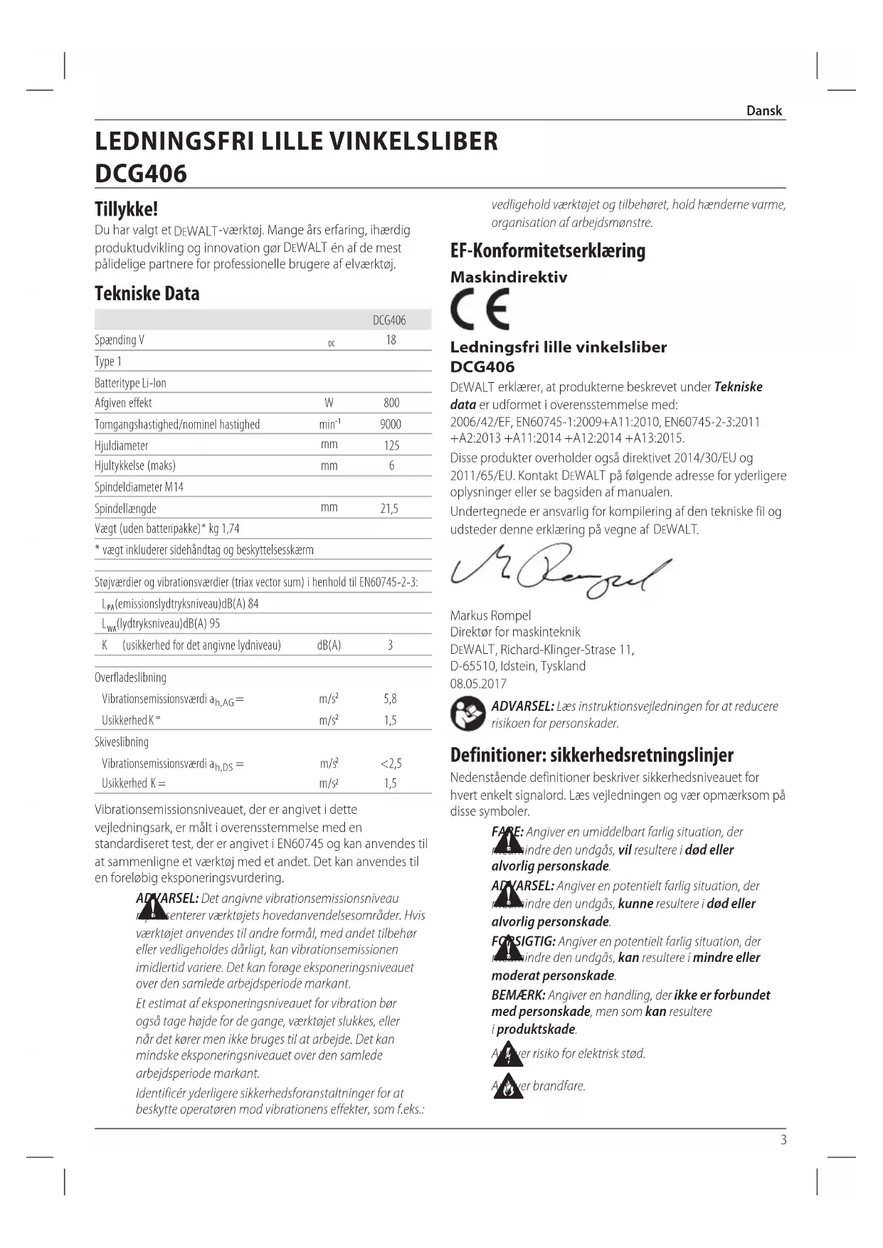 Undertegnede er ansvarlig for kompilering af den tekniske fil og udsteder donne erklæring pa vegne af DEWALT.