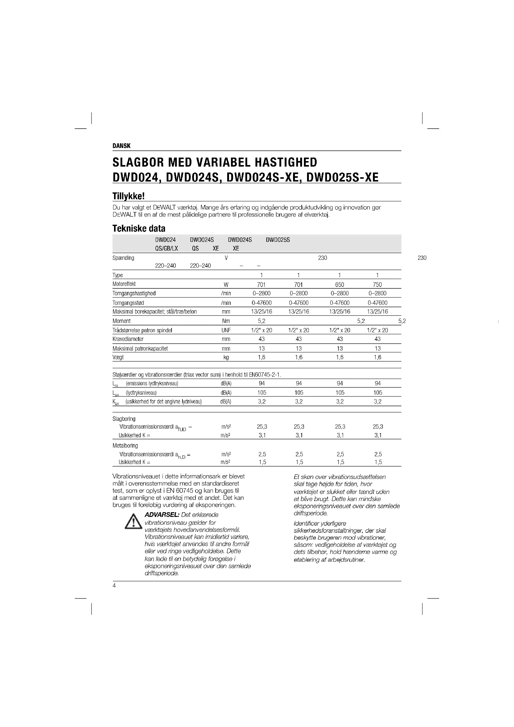 kontrollere borets rotation. ADVARSEL: Boret kan gå i stå, hvis det er overbelastet og resultere i en forvridning. Forvent altid standsningen. Hold godt fast for at kontrollere vridningen og undgå personskade.11 DANSK Nærmere oplysninger om det rigtige tilbehør fås hos forhandleren. Miljøbeskyttelse Særskilt bortskaffelse. Dette produkt må ikke bortskaffes sammen med almindeligt husholdningsaffald. Hvis du på noget tidspunkt finder det nødvendigt at udskifte dit DEWALT produkt, eller hvis det ikke længere tjener det tiltænkte formål, må det ikke bortskaffes med almindeligt husholdningsaffald. Sørg for, at dette produkt bortskaffes særskilt. Særskilt bortskaffelse af brugte produkter og emballage gør det muligt at genbruge materialer og anvende dem på ny. Genanvendelse af genbrugsmaterialer bidrager til at forhindre forurening af miljøet og reducerer behovet for råmaterialer. Lokale forskrifter muliggør i nogen tilfælde særskilt bortskaffelse af elektriske produkter fra husholdningen, ved kommunale affaldsdepoter eller hos forhandleren i forbindelse med køb af et nyt produkt. DEWALT har stillet faciliteter til rådighed til indsamling og genbrug af udslidte DEWALT produkter. For at benytte sig af denne service kan man returnere produktet til et hvilket som autoriseret serviceværksted, der modtager det på vore vegne. Du kan finde ud af, hvor det nærmeste autoriserede serviceværksted befinder sig ved at kontakte dit lokale DEWALT-kontor på den adresse, der er angivet i denne vejledning. Alternativt findes der en liste over autoriserede DEWALT serviceværksteder og detaljerede oplysninger om vores eftersalgsservice og kontakter på følgende internetadresse: www.2helpU.com. skal afbrydes, før montering og afmontering af tilbehør, før justering eller ændring af konfiguration eller ved udførelse af reparationer. Sørg for, at udløserkontakten er i OFF-position. Utilsigtet start kan medføre kvæstelser. Motorbørster DEWALT anvender et avanceret børstesystem, der automatisk standser boret, når børsterne er opbrugt. Dette forhindrer alvorlig skade på motoren. Nye børstesamlinger er tilgængelige hos autoriserede DEWALT-servicecentre. Anvend altid identiske reservedele. Smøring Dette elektriske værktøj skal ikke smøres yderligere. Rengøring ADVARSEL: Blæs støv og snavs ud af hovedhuset med tør luft, lige så snart der samler sig snavs i og omkring luftaftrækket. Bær godkendte beskyttelsesbriller og godkendt støvmaske ved udførelse af denne procedure. ADVARSEL: Brug aldrig opløsningsmidler eller andre kraftige kemikalier til at rengøre værktøjets ikke-metalliske dele. Disse kemikalier kan svække de materialer, der anvendes i disse dele. Brug en klud, der kun er fugtet med vand og mild sæbe. Der må under ingen omstændigheder komme væske ind i værktøjet. Ingen af værktøjets dele må nedsænkes i væske. Valgfrit tilbehør ADVARSEL: Da andet tilbehør end det, som stilles til rådighed af DEWALT, ikke er afprøvet med dette produkt, kan det være farligt at bruge sådant tilbehør med dette værktøj. For at mindske risikoen for personskade, må dette produkt kun anvendes med tilbehør, som anbefales af D EWALT. FORSIGTIG: For at reducere risikoen for skade bør tilbehør kun anvendes i størrelser op til det maksimale som vist i de tekniske specifikationer.12 DEUTSCH Sie haben sich für ein Werkzeug von DEWALT entschieden. Langjährige Erfahrung, sorgfältige Produktentwicklung und Innovation machen DEWALT zu einem zuverlässigen Partner für professionelle Anwender von Elektrowerkzeugen. Technische Daten DWD024 DWD024S DWD024S DWD025S QS/GB/LX QS XE XE Spannung V 230/ 230/ 230 230 220–240 220–240 – – Typ 1 1 1 1 Leistungsaufnahme W 701 701 650 750 Leerlaufdrehzahl /min 0–2800 0–2800 0–2800 0–2800 Leerlaufschlagzahl /min 0-47600 0-47600 0-47600 0-47600 Maximale Bohrleistung: Stahl/Holz/Beton mm 13/25/16 13/25/16 13/25/16 13/25/16 Drehmoment Nm 5,2 5,2 5,2 5,2 Spannfutter-Spindelgewinde UNF 1/2" x 20 1/2" x 20 1/2" x 20 1/2" x 20 Spannhalsdurchmesser mm 43 43 43 43 Max. Bohrfutter-spannweite mm 13 13 13 13 Gewicht kg 1,6 1,6 1,6 1,6 Lärmwerte und Vibrationswerte (Triax-Vektorsumme) gemäß EN60745-2-1.