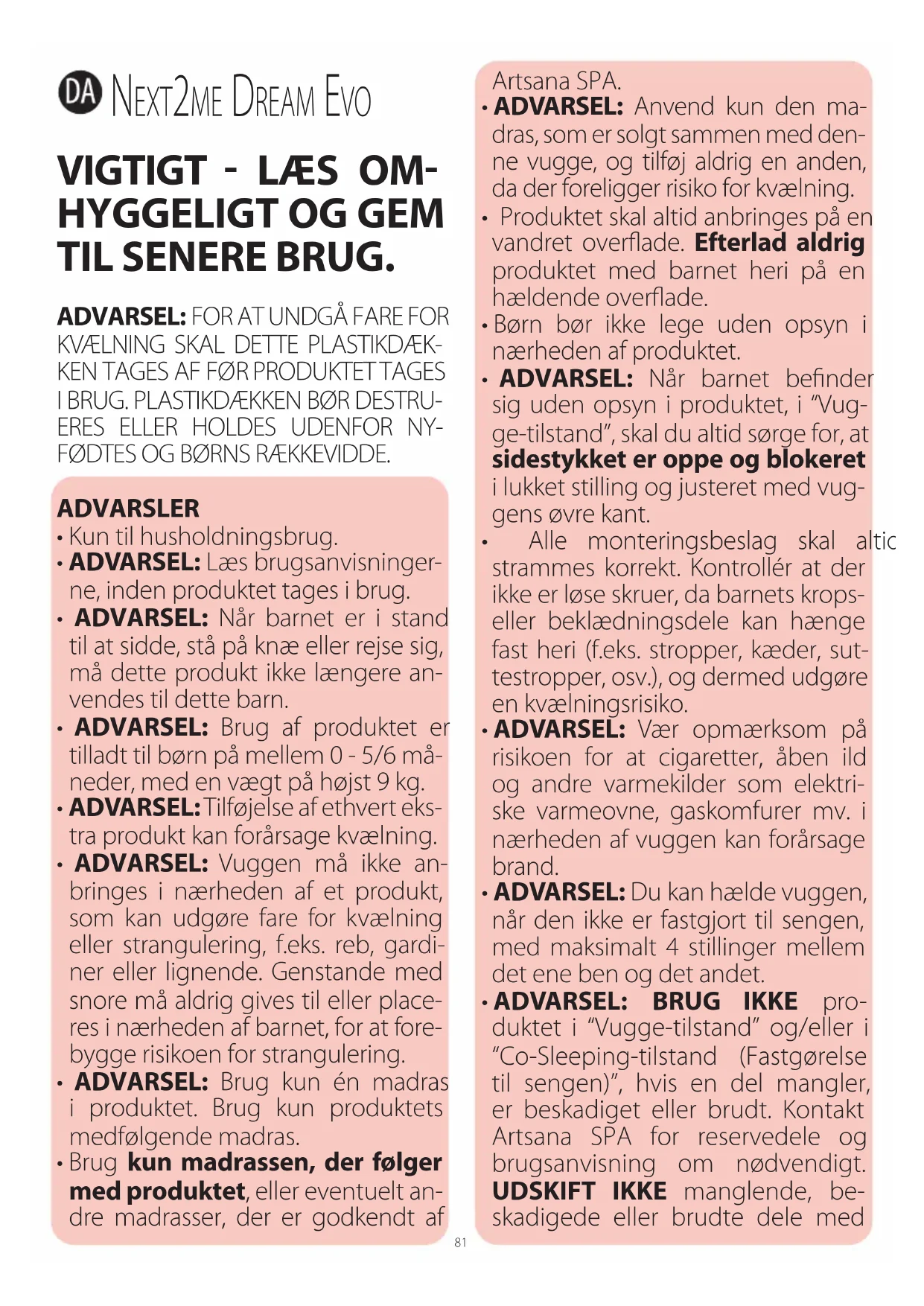 ADVARSEL: BRUG IKKE Produktet i "Vugge-tilstand" og/eller i "Co-Sleeping-tilstand (Fastgorelseti sengen)", hvis en del mangler, er beskadiget eller brudt. Kontakt Artsana SPA for reservedele og brugsanvisning om nødvendigt.