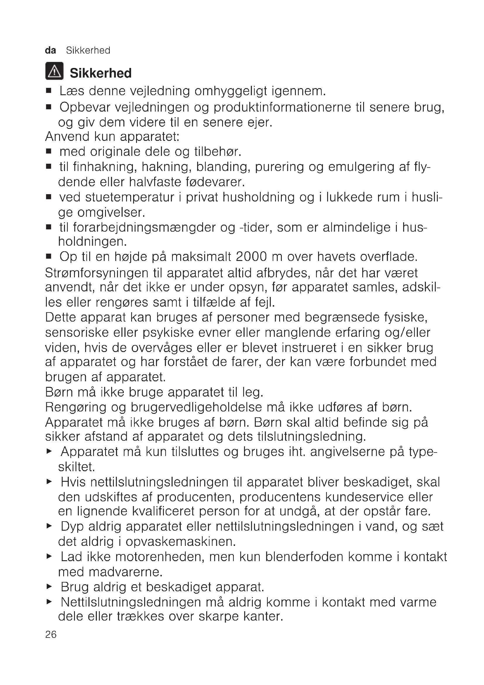 Sikkerhed ¡ Læs denne vejledning omhyggeligt igennem. ¡ Opbevar vejledningen og produktinformationerne til senere brug, og giv dem videre til en senere ejer. Anvend kun apparatet: ¡ med originale dele og tilbehør. ¡ til finhakning, hakning, blanding, purering og emulgering af fly- dende eller halvfaste fødevarer. ¡ ved stuetemperatur i privat husholdning og i lukkede rum i husli- ge omgivelser. ¡ til forarbejdningsmængder og -tider, som er almindelige i hus- holdningen. ¡ Op til en højde på maksimalt 2000m over havets overflade. Strømforsyningen til apparatet altid afbrydes, når det har været anvendt, når det ikke er under opsyn, før apparatet samles, adskil- les eller rengøres samt i tilfælde af fejl. Dette apparat kan bruges af personer med begrænsede fysiske, sensoriske eller psykiske evner eller manglende erfaring og/eller viden, hvis de overvåges eller er blevet instrueret i en sikker brug af apparatet og har forstået de farer, der kan være forbundet med brugen af apparatet. Børn må ikke bruge apparatet til leg. Rengøring og brugervedligeholdelse må ikke udføres af børn. Apparatet må ikke bruges af børn. Børn skal altid befinde sig på sikker afstand af apparatet og dets tilslutningsledning. ▶ Apparatet må kun tilsluttes og bruges iht. angivelserne på type- skiltet. ▶ Hvis nettilslutningsledningen til apparatet bliver beskadiget, skal den udskiftes af producenten, producentens kundeservice eller en lignende kvalificeret person for at undgå, at der opstår fare. ▶ Dyp aldrig apparatet eller nettilslutningsledningen i vand, og sæt det aldrig i opvaskemaskinen. ▶ Lad ikke motorenheden, men kun blenderfoden komme i kontakt med madvarerne. ▶ Brug aldrig et beskadiget apparat. ▶ Nettilslutningsledningen må aldrig komme i kontakt med varme dele eller trækkes over skarpe kanter.Forhindring af materielle skader da