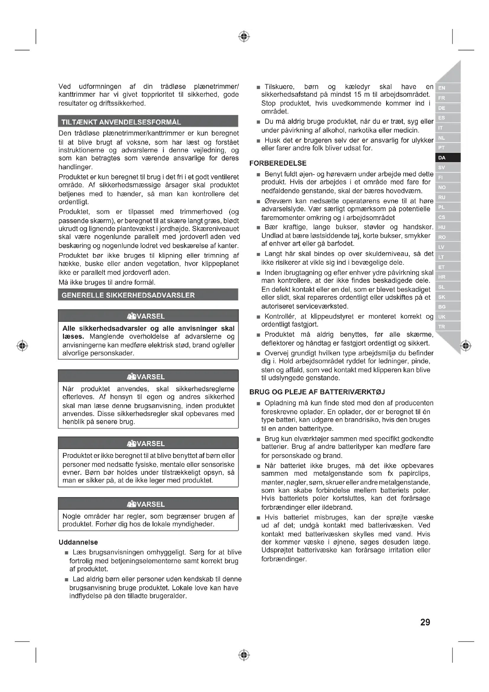 Den trådløse plænetrimmer/kanttrimmer er kun beregnet til at blive brugt af voksne, som har læst og forstået instruktionerne og advarslerne i denne vejledning, og som kan betragtes som værende ansvarlige for deres handlinger. Produktet er kun beregnet til brug i det fri i et godt ventileret område. Af sikkerhedsmæssige årsager skal produktet betjenes med to hænder, så man kan kontrollere det ordentligt. Produktet, som er tilpasset med trimmerhoved (og passende skærm), er beregnet til at skære langt græs, blødt ukrudt og lignende plantevækst i jordhøjde. Skæreniveauet skal være nogenlunde parallelt med jordoverfl aden ved beskæring og nogenlunde lodret ved beskærelse af kanter. Produktet bør ikke bruges til klipning eller trimning af hække, buske eller anden vegetation, hvor klippeplanet ikke er parallelt med jordoverfl aden. Må ikke bruges til andre formål. GENERELLE SIKKERHEDSADVARSLER ADVARSEL Alle sikkerhedsadvarsler og alle anvisninger skal læses. Manglende overholdelse af advarslerne og anvisningerne kan medføre elektrisk stød, brand og/eller alvorlige personskader. ADVARSEL Når produktet anvendes, skal sikkerhedsreglerne efterleves. Af hensyn til egen og andres sikkerhed skal man læse denne brugsanvisning, inden produktet anvendes. Disse sikkerhedsregler skal opbevares med henblik på senere brug. ADVARSEL Produktet er ikke beregnet til at blive benyttet af børn eller personer med nedsatte fysiske, mentale eller sensoriske evner. Børn bør holdes under tilstrækkeligt opsyn, så man er sikker på, at de ikke leger med produktet. ADVARSEL Nogle områder har regler, som begrænser brugen af produktet. Forhør dig hos de lokale myndigheder. Uddannelse ■ Læs brugsanvisningen omhyggeligt. Sørg for at blive fortrolig med betjeningselementerne samt korrekt brug af produktet. ■ Lad aldrig børn eller personer uden kendskab til denne brugsanvisning bruge produktet. Lokale love kan have indflydelse på den tilladte brugeralder. ■ Tilskuere, børn og kæledyr skal have en sikkerhedsafstand på mindst 15 m til arbejdsområdet. Stop produktet, hvis uvedkommende kommer ind i området. ■ Du må aldrig bruge produktet, når du er træt, syg eller under påvirkning af alkohol, narkotika eller medicin. ■ Husk det er brugeren selv der er ansvarlig for ulykker eller farer andre folk bliver udsat for. FORBEREDELSE ■ Benyt fuldt øjen- og høreværn under arbejde med dette produkt. Hvis der arbejdes i et område med fare for nedfaldende genstande, skal der bæres hovedværn. ■ Øreværn kan nedsætte operatørens evne til at høre advarselslyde. Vær særligt opmærksom på potentielle faremomenter omkring og i arbejdsområdet ■ Bær kraftige, lange bukser, støvler og handsker. Undlad at bære løstsiddende tøj, korte bukser, smykker af enhver art eller gå barfodet. ■ Langt hår skal bindes op over skulderniveau, så det ikke risikerer at vikle sig ind i bevægelige dele. ■ Inden ibrugtagning og efter enhver ydre påvirkning skal man kontrollere, at der ikke findes beskadigede dele. En defekt kontakt eller en del, som er blevet beskadiget eller slidt, skal repareres ordentligt eller udskiftes på et autoriseret serviceværksted. ■ Kontrollér, at klippeudstyret er monteret korrekt og ordentligt fastgjort. ■ Produktet må aldrig benyttes, før alle skærme, deflektorer og håndtag er fastgjort ordentligt og sikkert. ■ Overvej grundigt hvilken type arbejdsmiljø du befinder dig i. Hold arbejdsområdet ryddet for ledninger, pinde, sten og affald, som ved kontakt med klipperen kan blive til udslyngede genstande. BRUG OG PLEJE AF BATTERIVÆRKTØJ ■ Opladning må kun finde sted med den af producenten foreskrevne oplader. En oplader, der er beregnet til én type batteri, kan udgøre en brandrisiko, hvis den bruges til en anden batteritype. ■ Brug kun elværktøjer sammen med specifikt godkendte batterier. Brug af andre batterityper kan medføre fare for personskade og brand. ■ Når batteriet ikke bruges, må det ikke opbevares sammen med metalgenstande som fx papirclips, mønter, nøgler, søm, skruer eller andre metalgenstande, som kan skabe forbindelse mellem batteriets poler. Hvis batteriets poler kortsluttes, kan det forårsage forbrændinger eller ildebrand. ■ Hvis batteriet misbruges, kan der sprøjte væske ud af det; undgå kontakt med batterivæsken. Ved kontakt med batterivæsken skylles med vand. Hvis der kommer væske i øjnene, søges desuden læge. Udsprøjtet batterivæske kan forårsage irritation eller forbrændinger.30 | Dansk PLÆNETRIMMER/KANTTRIMMER, SIKKERHEDSADVARSLER ■ Produktet må aldrig benyttes af børn, personer med begrænsede fysiske, sensoriske eller mentale evner eller manglende erfaring og viden, eller af folk, der ikke er fortrolige med denne brugsanvisning. ■ Anvend produktet i dagslys eller godt kunstigt lys. ■ Undgå brug på vådt græs. ■ Sørg for altid at have godt fodfæste og god balance, især på skråninger. ■ Undgå at gå baglæns under brug af produktet. ■ Gå, løb aldrig. ■ Hold klippehovedet under hofteniveau. ■ Brug aldrig produktet med beskadigede skærme eller uden påmonterede skærme. ■ Anvend aldrig en metalsnor i enheden. ■ Hold altid hænder og fødder væk fra skæredelene, dette især når motoren tændes. ■ Vær opmærksom på, at de skærende dele fortsætter med at rotere, efter at motoren er slukket. ■ Pas på bortslyngede objekter fra klippeudstyr. Fjern affald som små sten, ral og andre fremmedlegemer fra arbejdsområdet, inden arbejdets start. Ledninger og snore kan blive viklet ind i klippeudstyret. ■ Sluk produktet, og tag batteriet ud inden: ● servicering ● at efterlade produktet uden opsyn ● rengøring af produktet ● Udskiftning af tilbehør ● kontrol for evt. skader efter kollision med et objekt ● kontrol for evt. skader, hvis produktet begynder at vibrere unormalt ● udførelse af vedligeholdelsesarbejde ■ Benyt fuldt øjen-